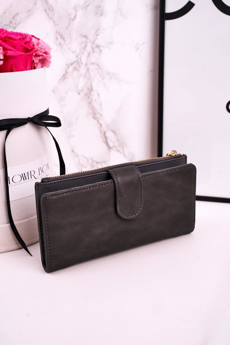 Duży i praktyczny portfel zapinany na zamek i zatrzask. Portfel pomieści bilon, banknoty oraz karty płatnicze i dokumenty. Wykonany ze skóry ekologicznej, dostępny w kilku kolorach. W zestawie znajduje się mała portmonetka zapinana na zamek.