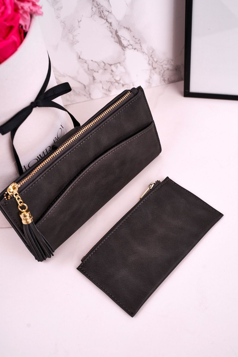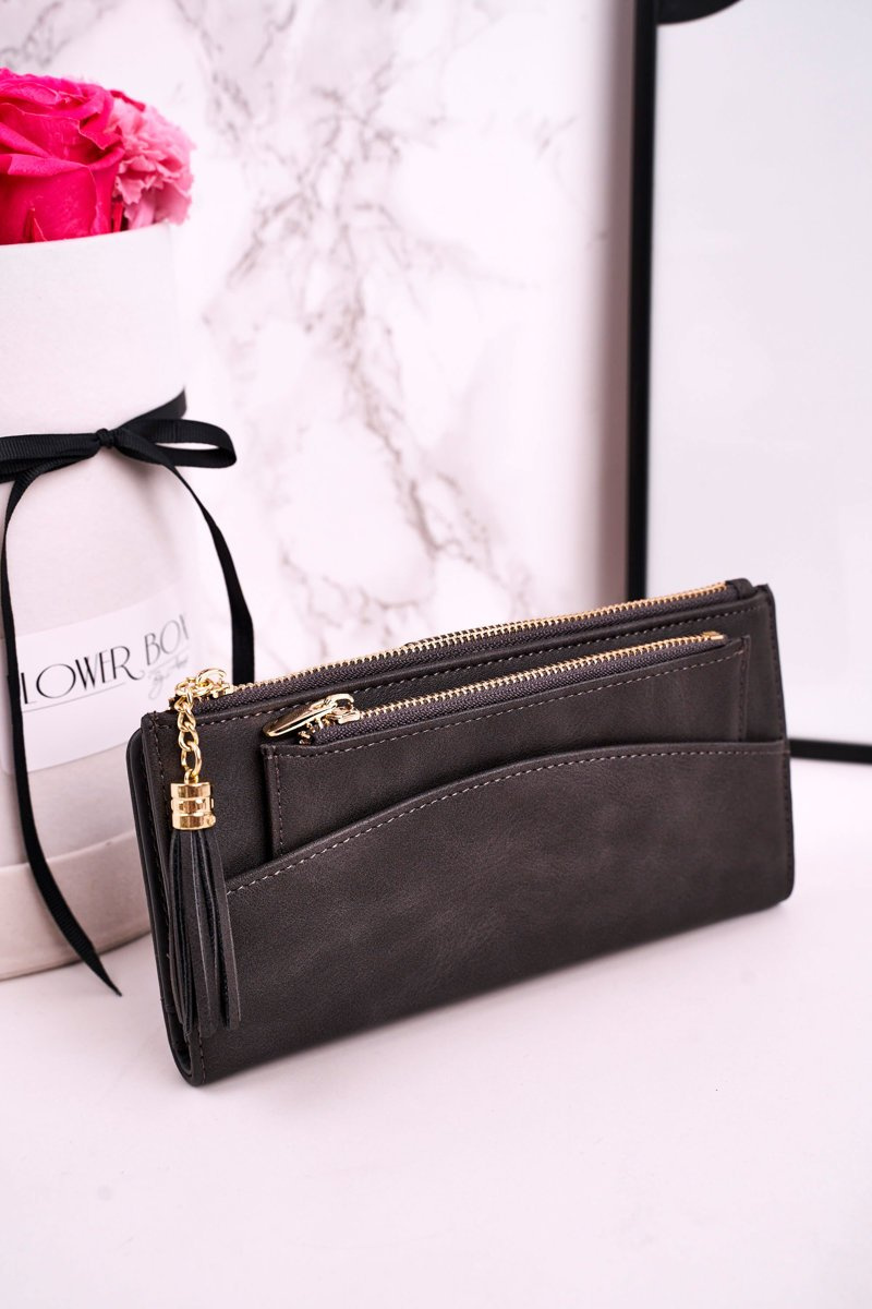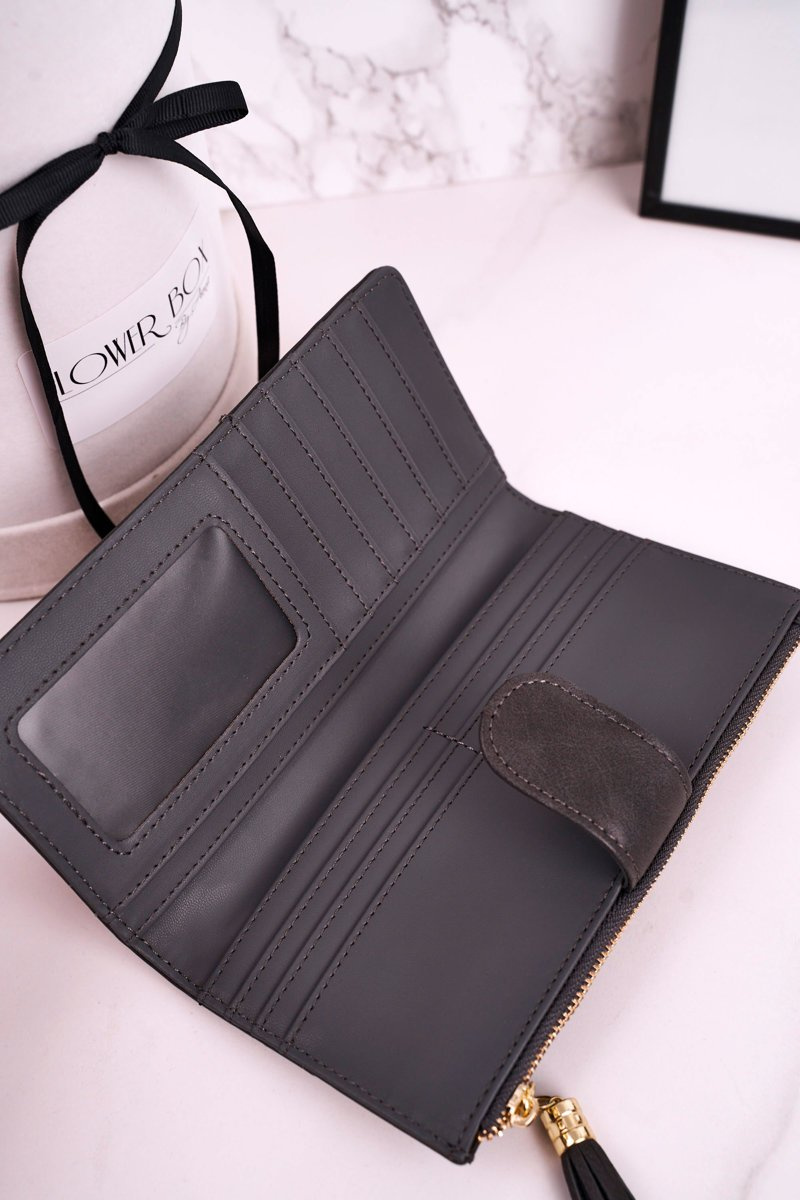 Duży Portfel Damski Z Dodatkową Portmonetką I Frędzlami Szary