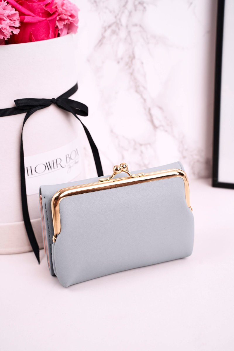 Średniej wielkości portfel damski zapinany na bigiel. Portfel pomieści bilon, banknoty oraz karty płatnicze. Wykonany ze skóry ekologicznej.