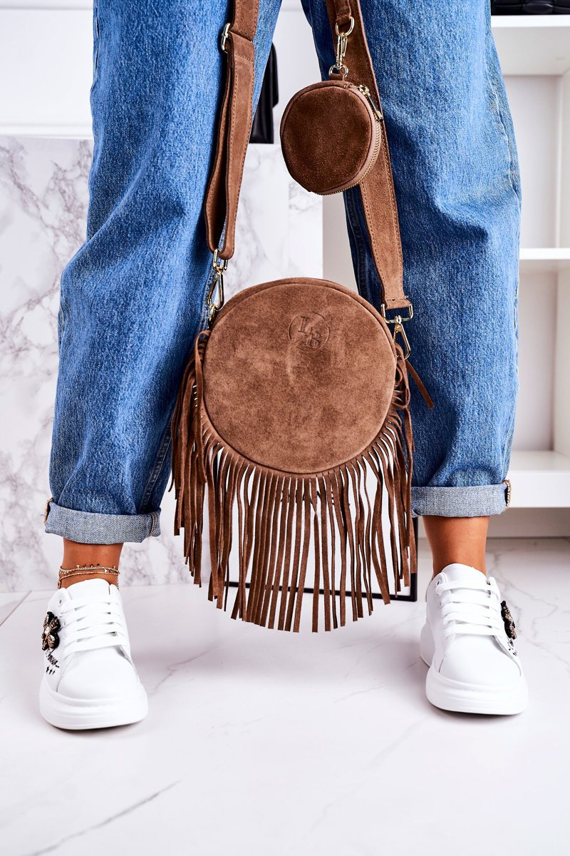 Torebka Skórzana Okrągła Z Frędzlami Boho LAURA BIAGGI Beżowa
