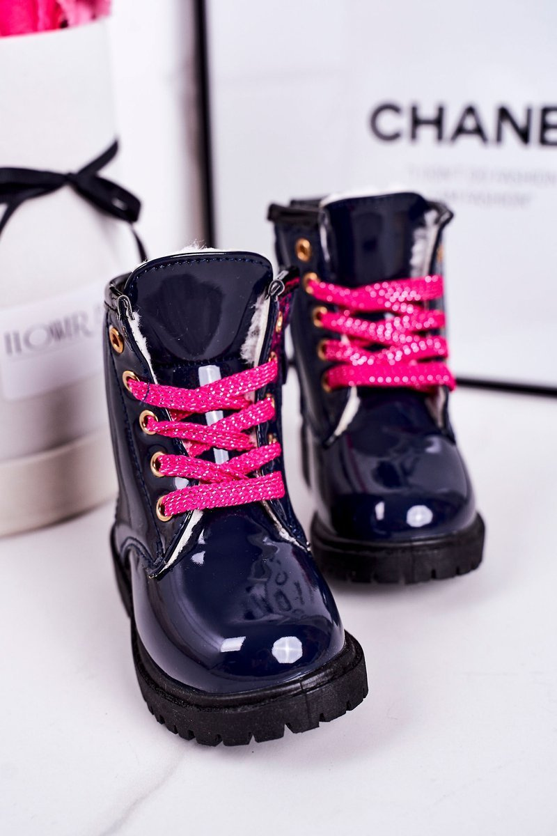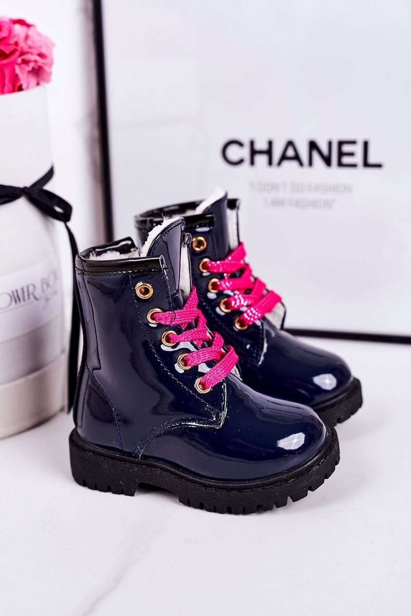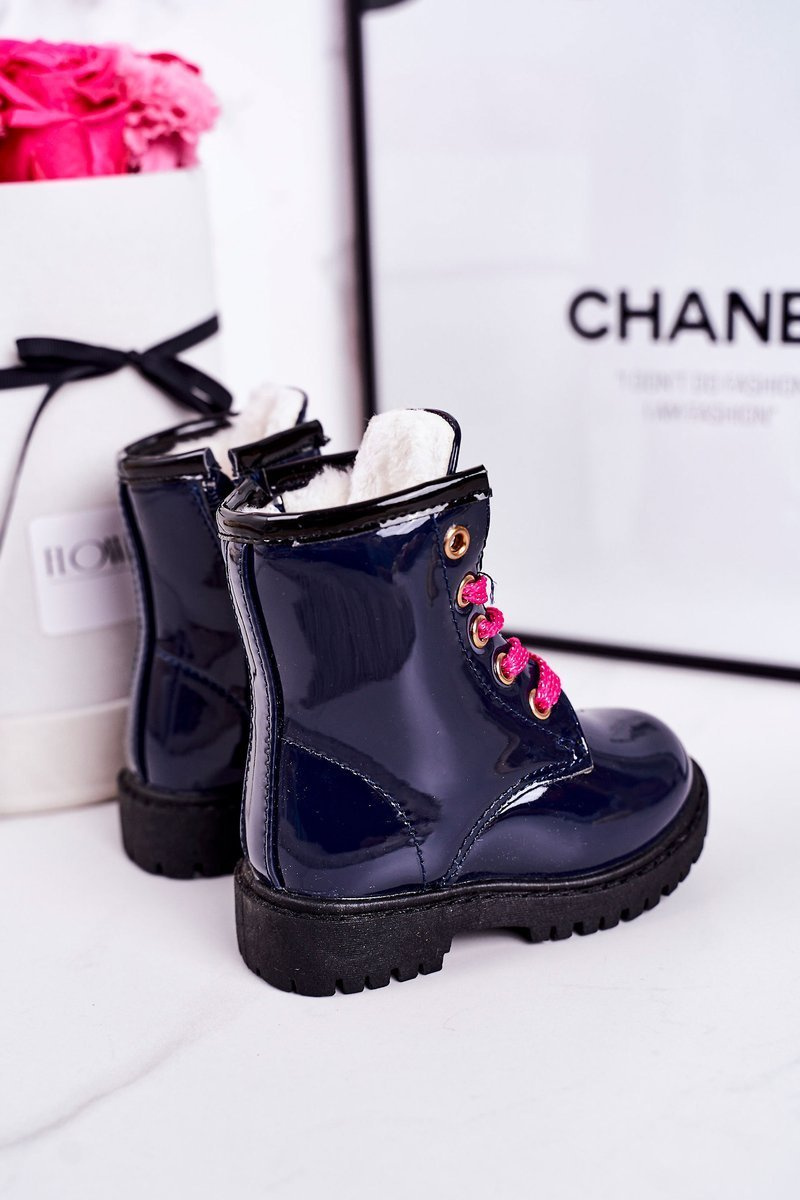 Dziecięce Botki Ocieplone Futerkiem Lakierowane Granatowe Pinkie