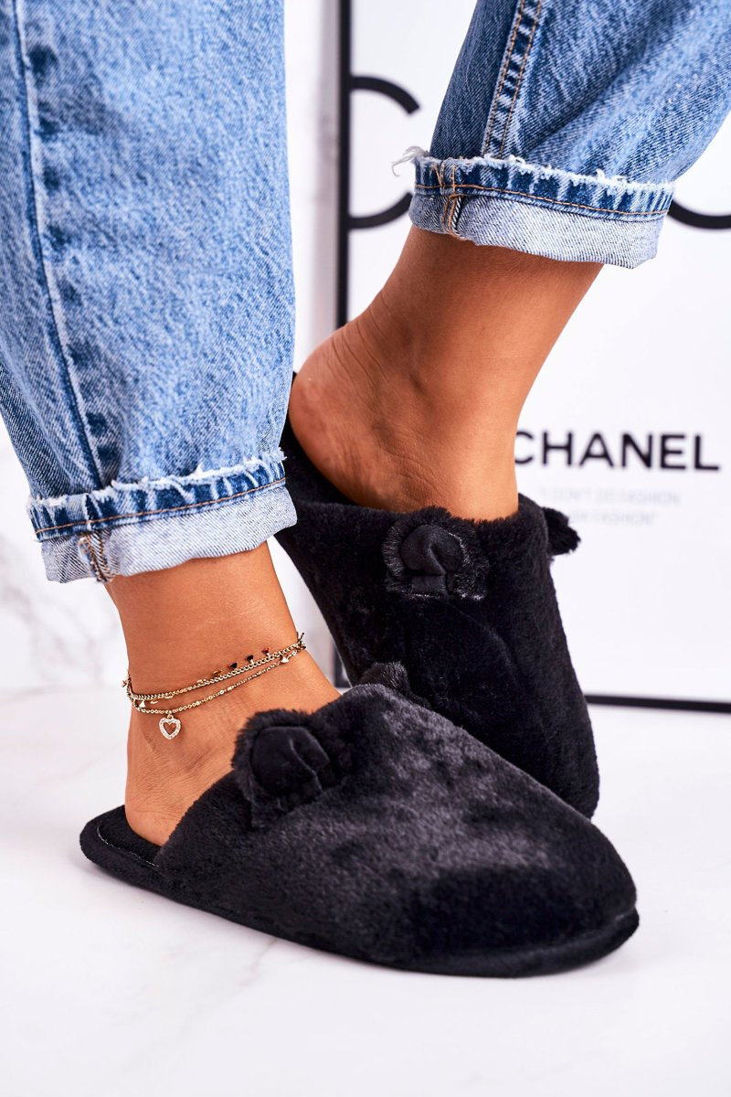 Damskie Futrzane Papcie Z Uszami Czarne Hippo