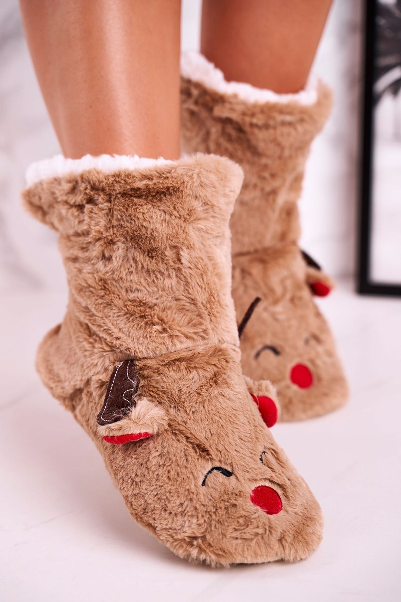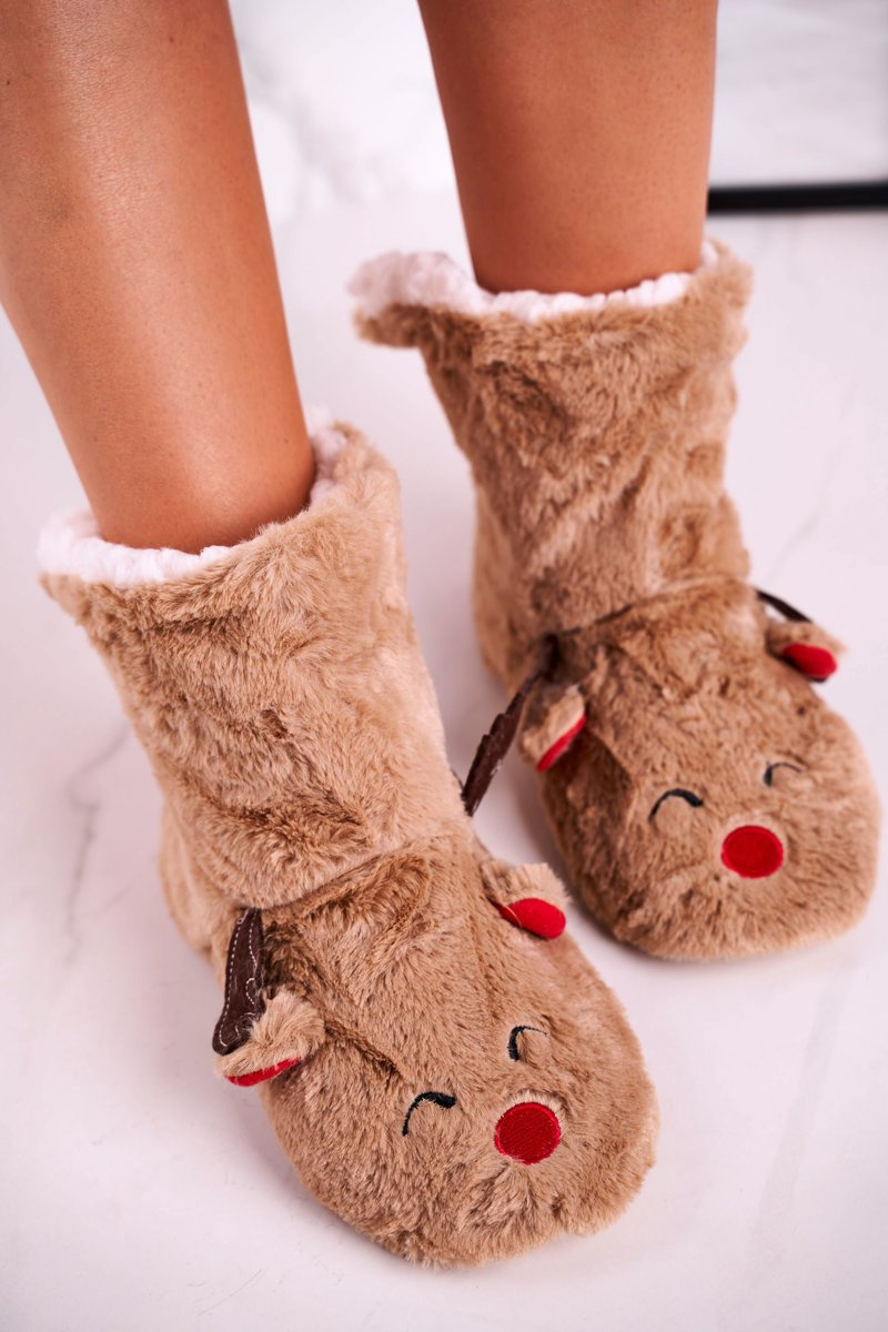 Świąteczne Papcie Z Reniferem Ocieplone Kożuszkiem Beżowe Rudolph