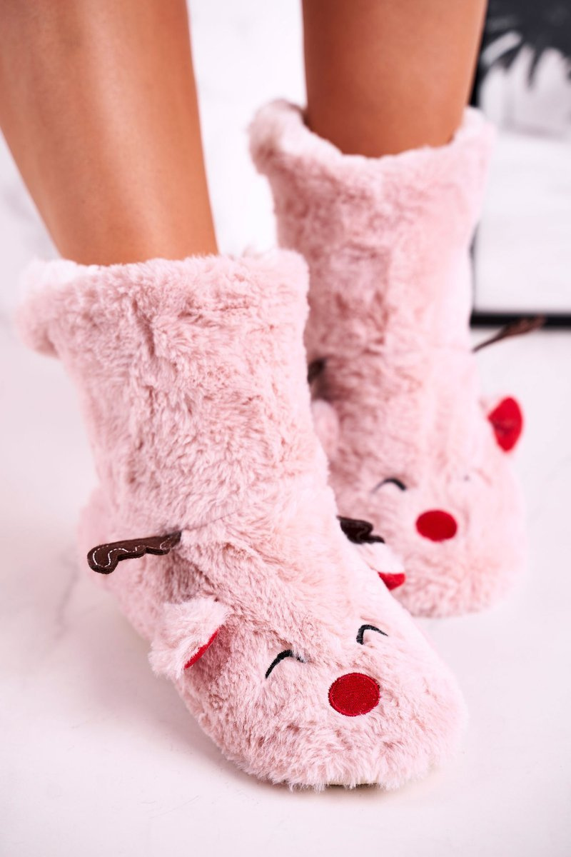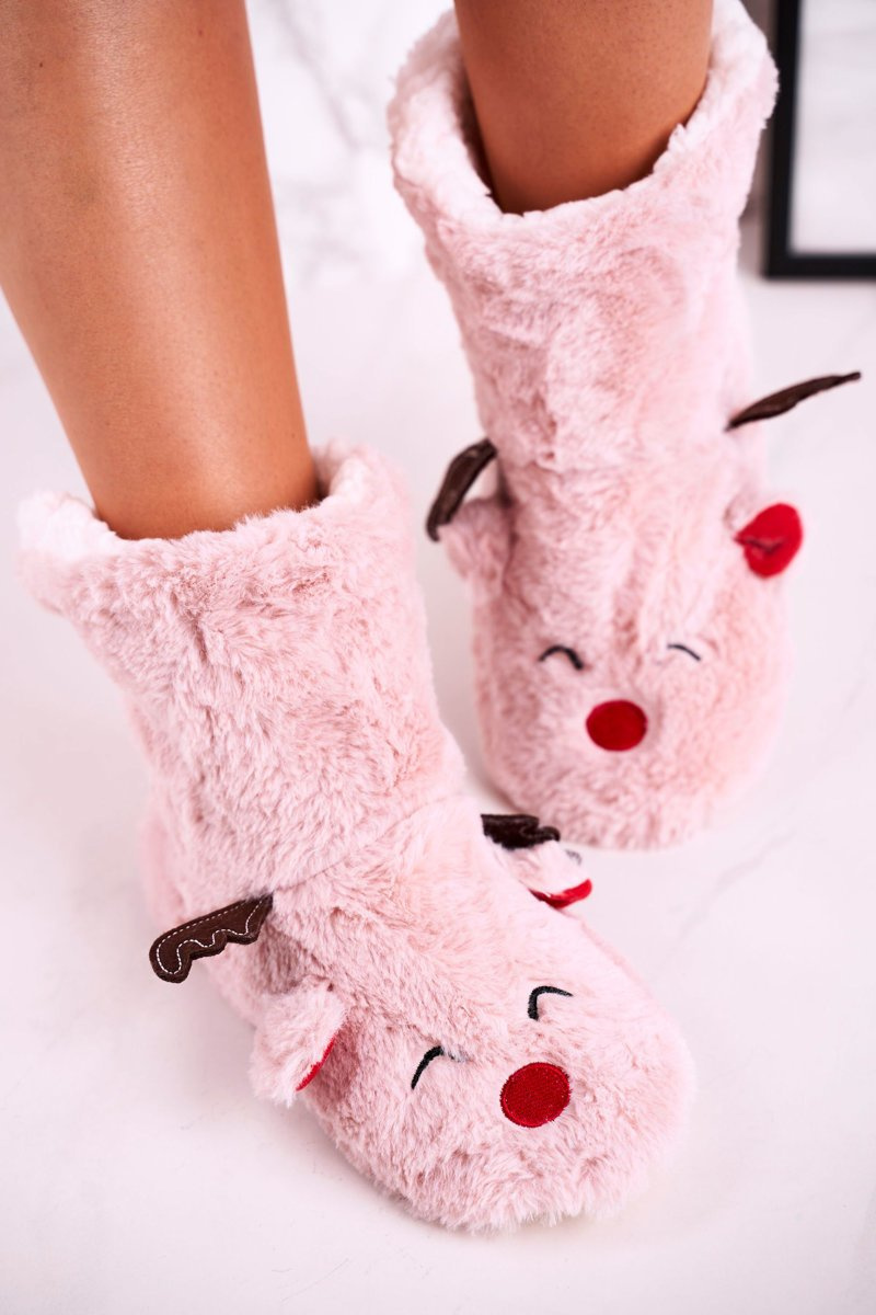 Świąteczne Papcie Z Reniferem Ocieplone Kożuszkiem Różowe Rudolph