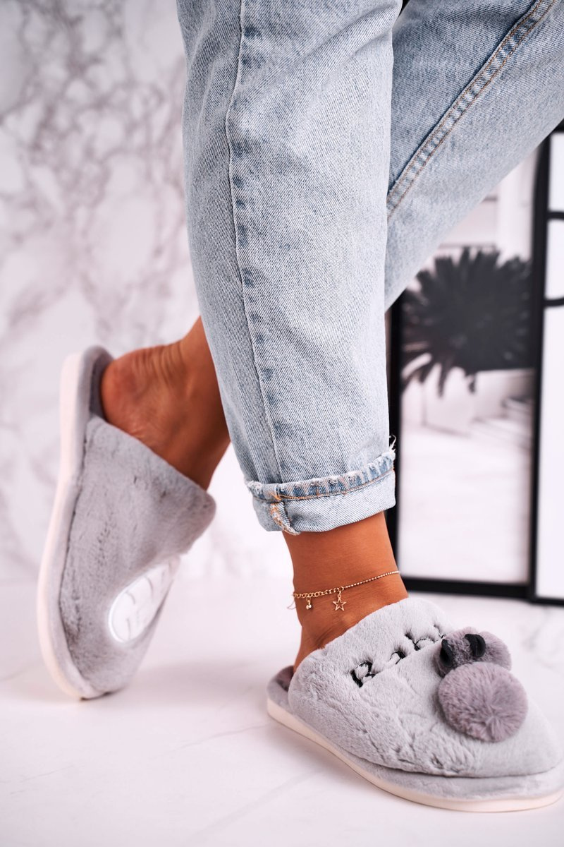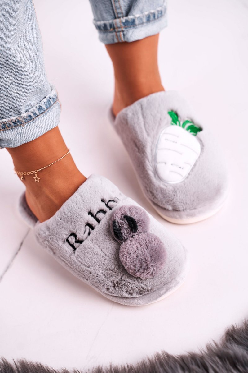 Damskie Futrzane Papcie z Królikiem I Marchewką Szare Follow Me