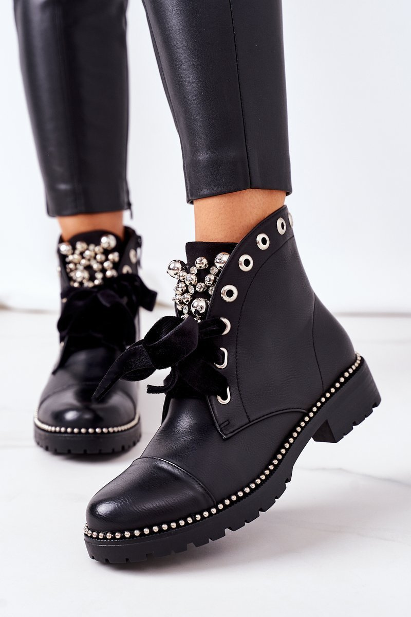 Ocieplane Botki Z Metalowymi Perełkami, Dżetami I Wstążką Czarne Perla Kod produktu: 15955