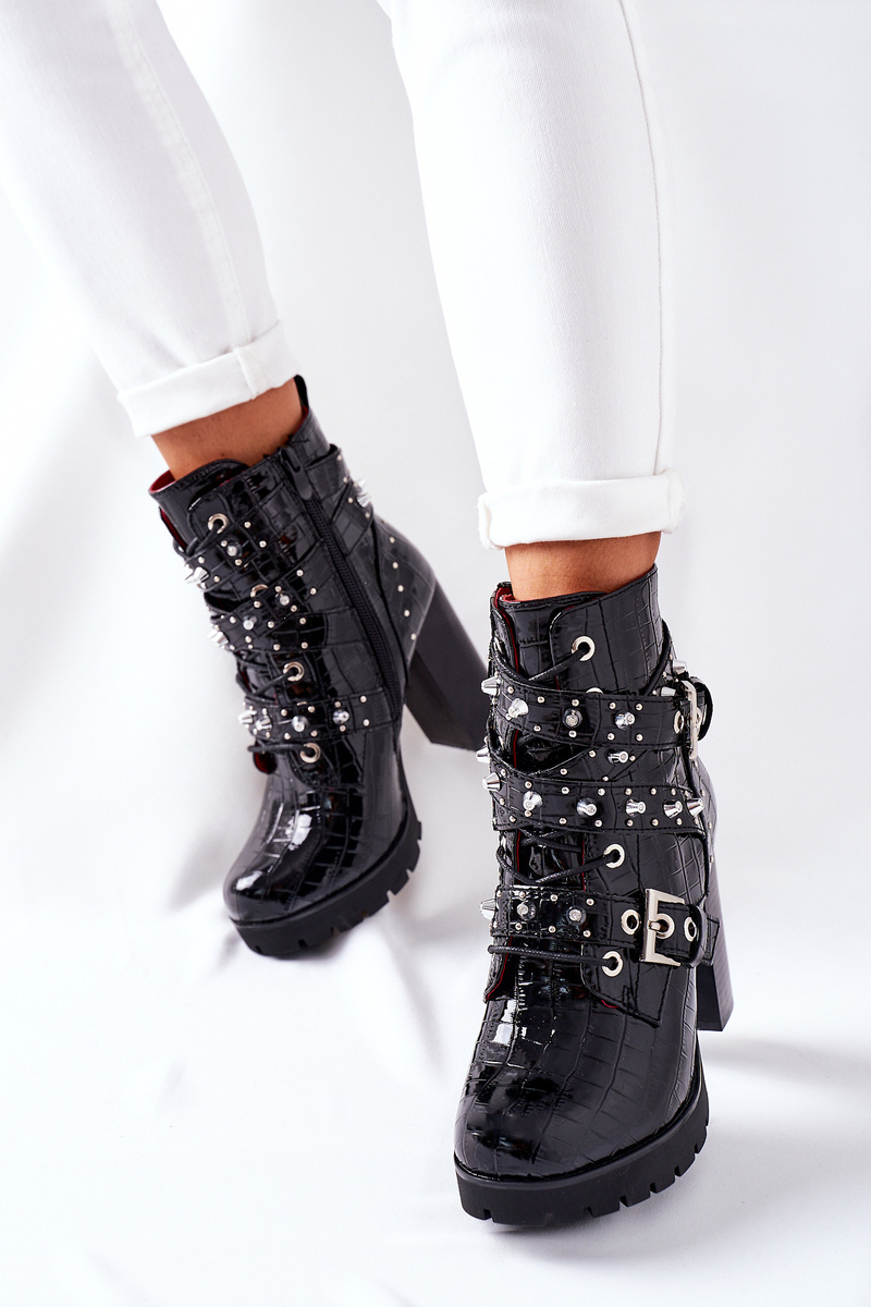 Czarne lakierowane botki to hit tego sezonu! Wnętrze butów wyścielone miłym w dotyku kocem obuwniczym! Suwak na boku ułatwi zakładanie! Botki zdobione stalowymi wstawkami na klamrach. Podczas wyboru rozmiaru prosimy kierować się tabelą rozmiarów.