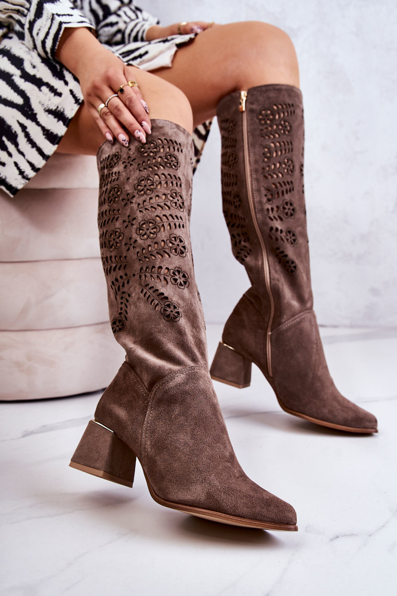 Zamszowe Kozaki Lewski Ażurowe Brązowe Romena