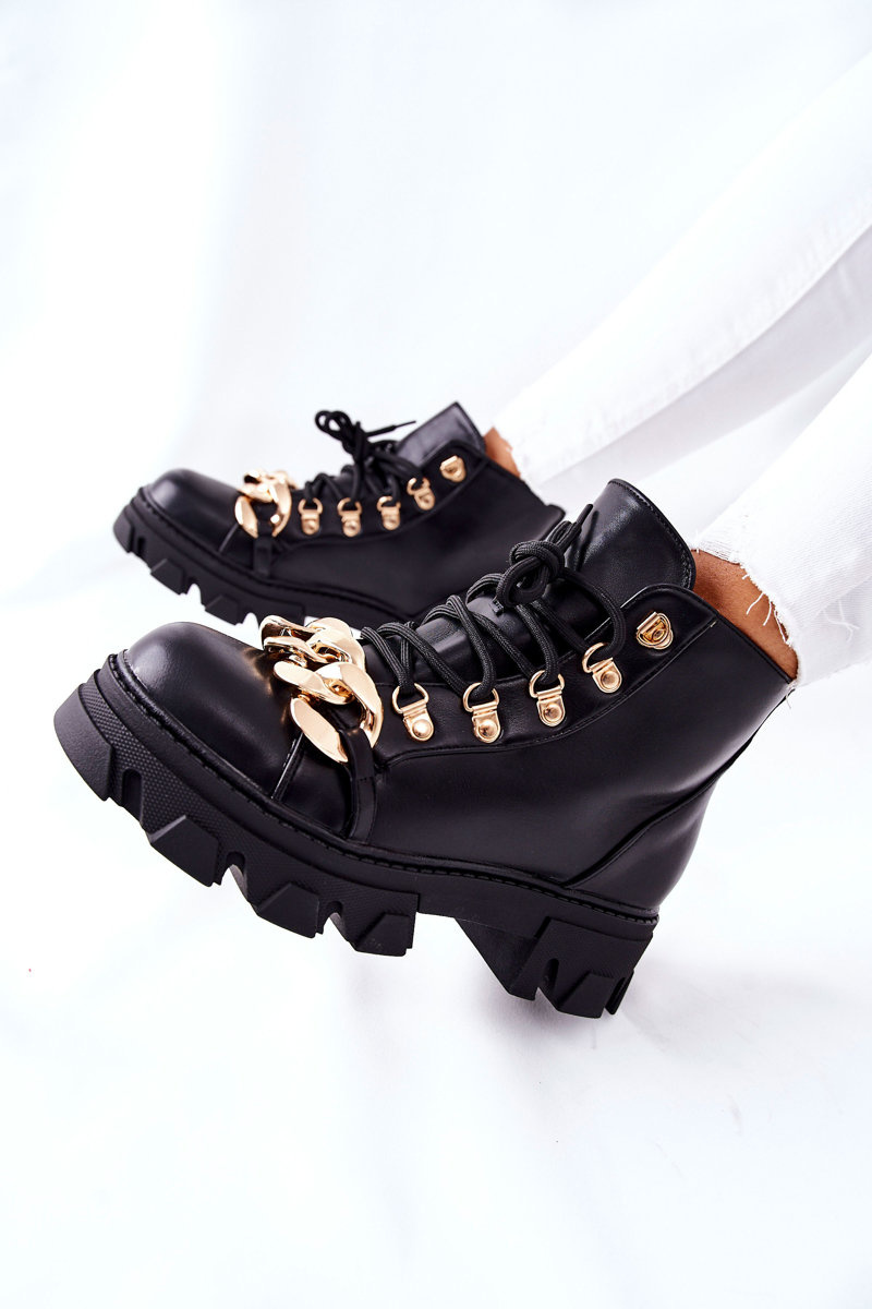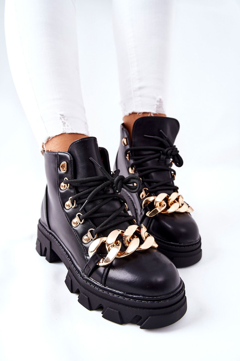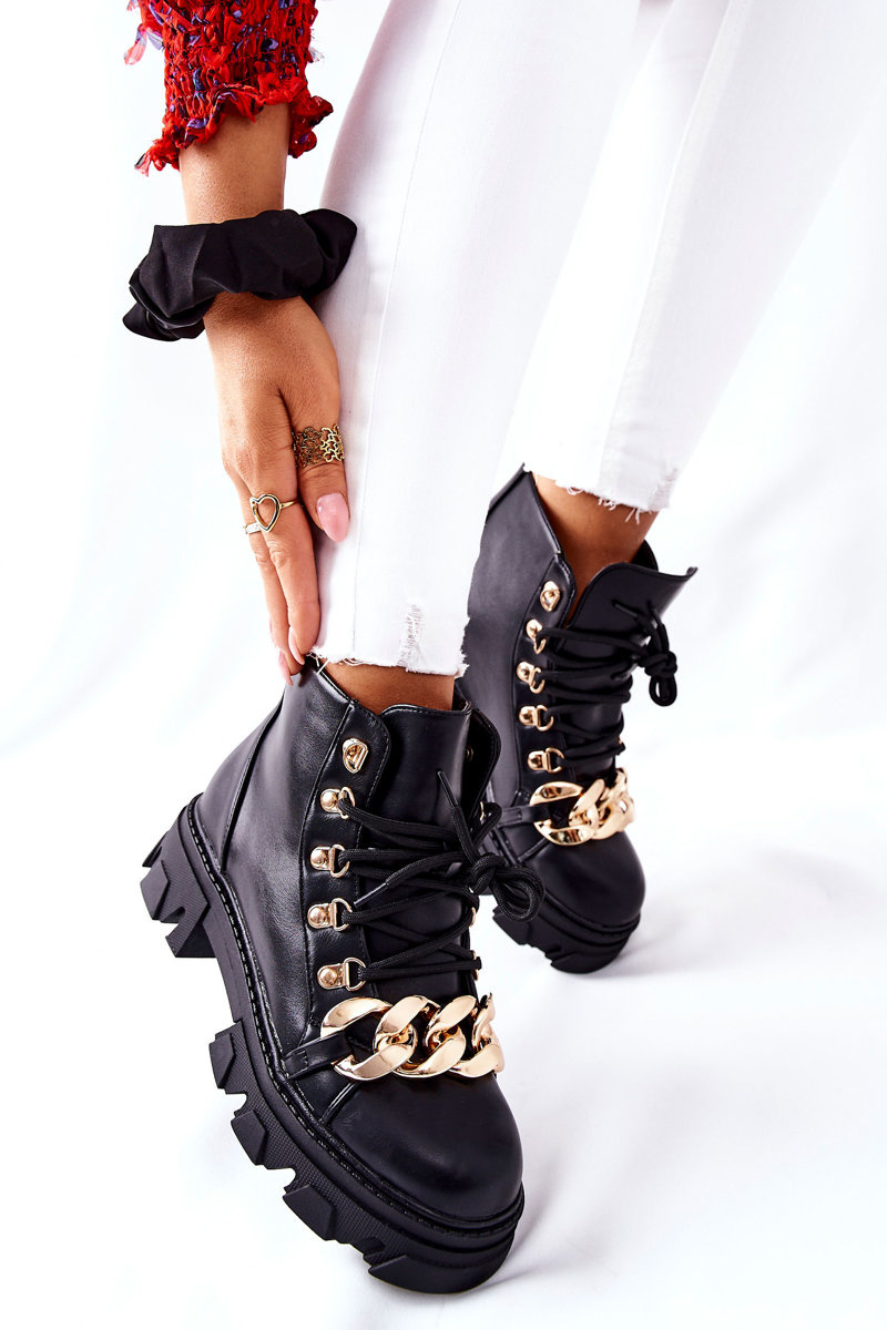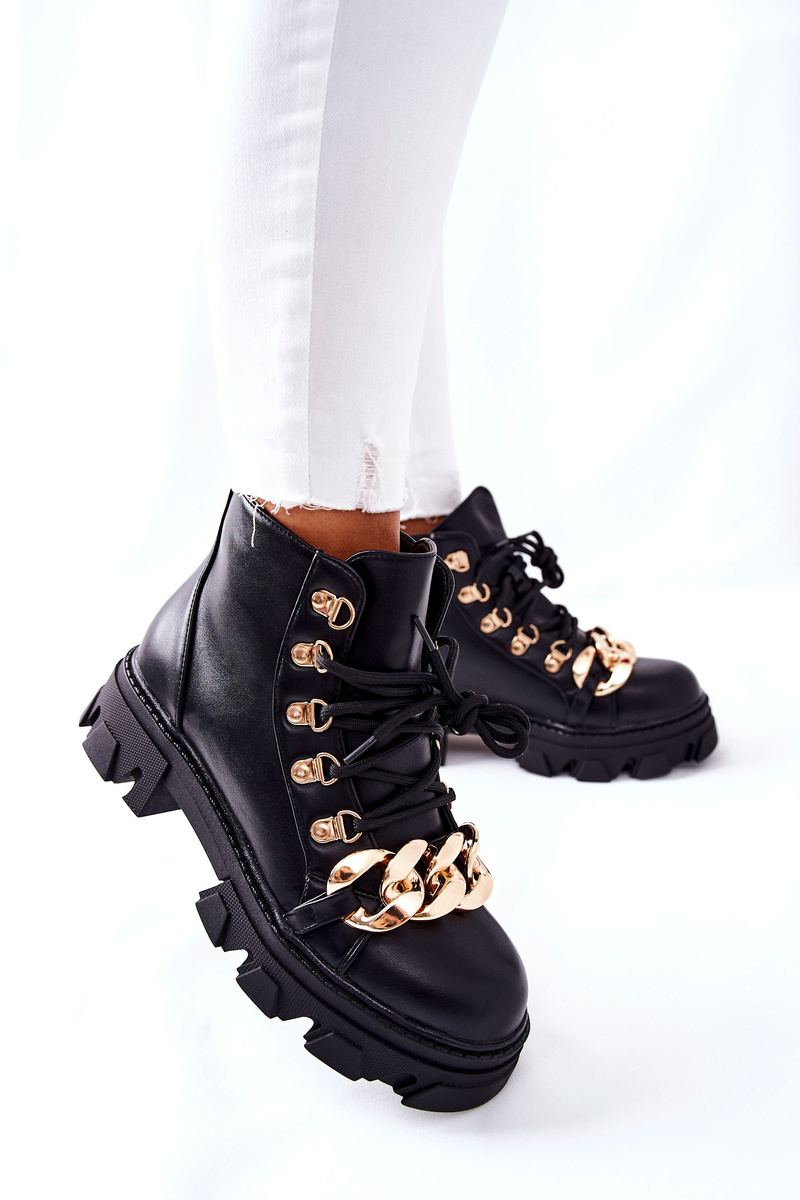 Buty, które są nieodłącznym elementem jesienno-zimowych stylizacji. Botki w całości zostały wykonane ze skóry ekologicznej. Gruba podeszwa oraz złote zdobienia w postaci łańcucha i złotych oczek, Wnętrze buta pokryte delikatnym ociepleniem w postaci koca obuwniczego. Przy wyborze rozmiaru prosimy sugerować się tabelą rozmiarów.