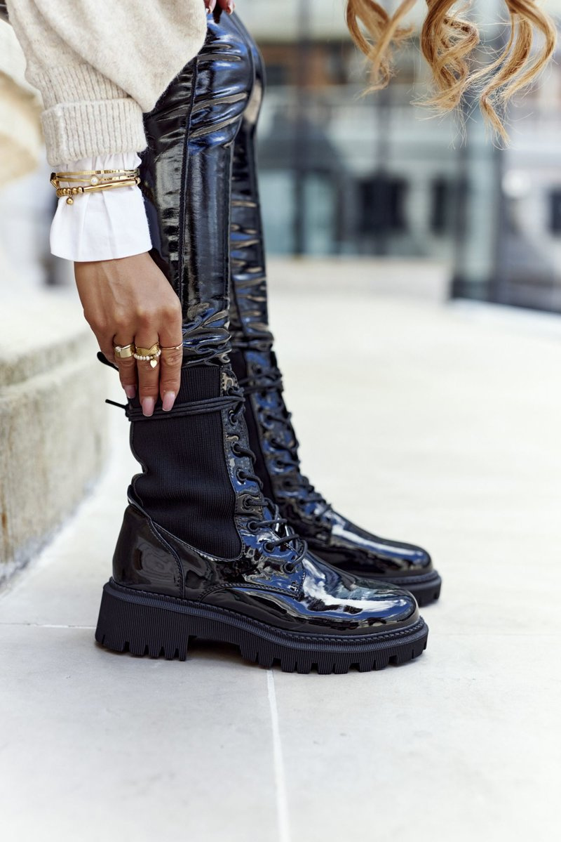 Modne botki, które są hitem tego sezonu! Wierzch wykonany z lakierowanej skóry ekologicznej. Wysoka, rozciągliwa cholewka, z wszytymi po bokach gumkami zapewni idealne dopasowanie. Model klasycznie sznurowany. Przy wyborze rozmiaru prosimy sugerować się tabelą rozmiarów.