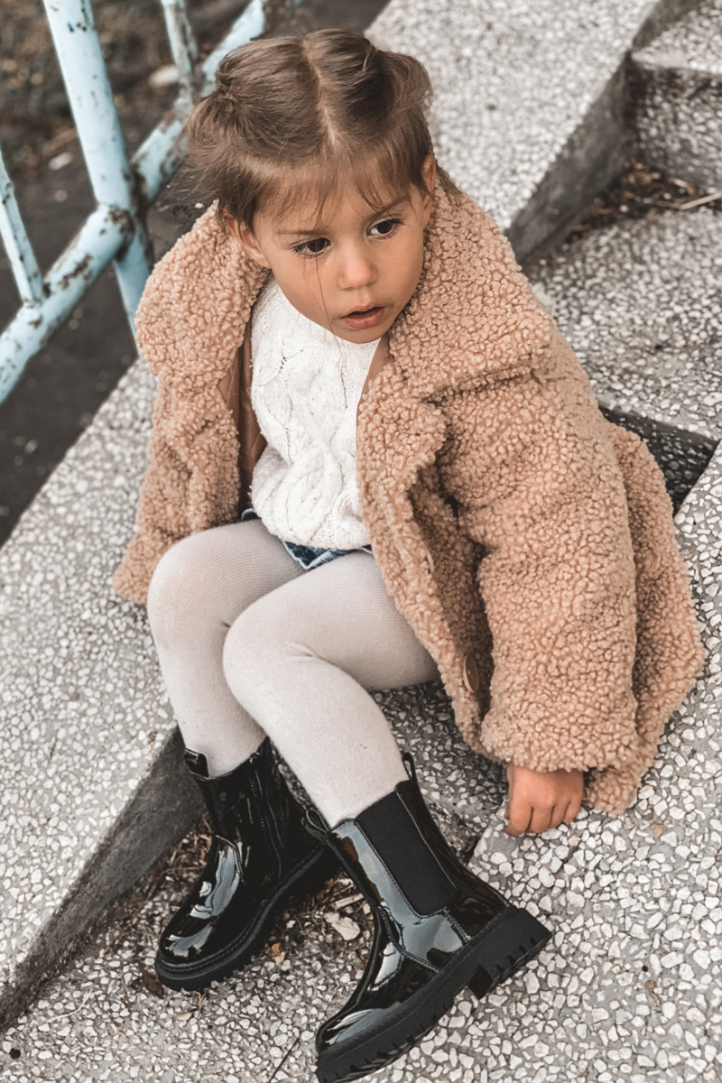Dziecięce botki. Zakładanie ułatwi wszyty z boku suwak. Wykonane z lakierowanej skóry ekologicznej. Ocieplane kocem obuwniczym. Przy wyborze rozmiaru prosimy kierować tabelą rozmiarów.