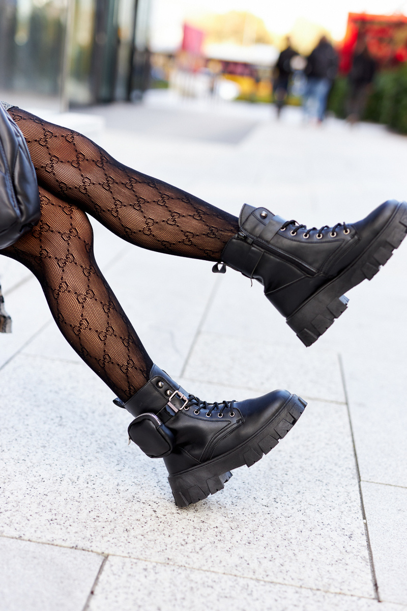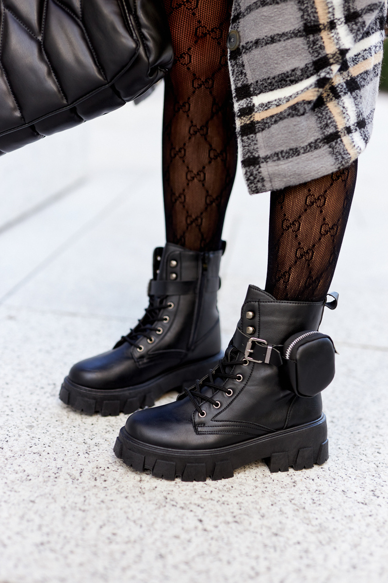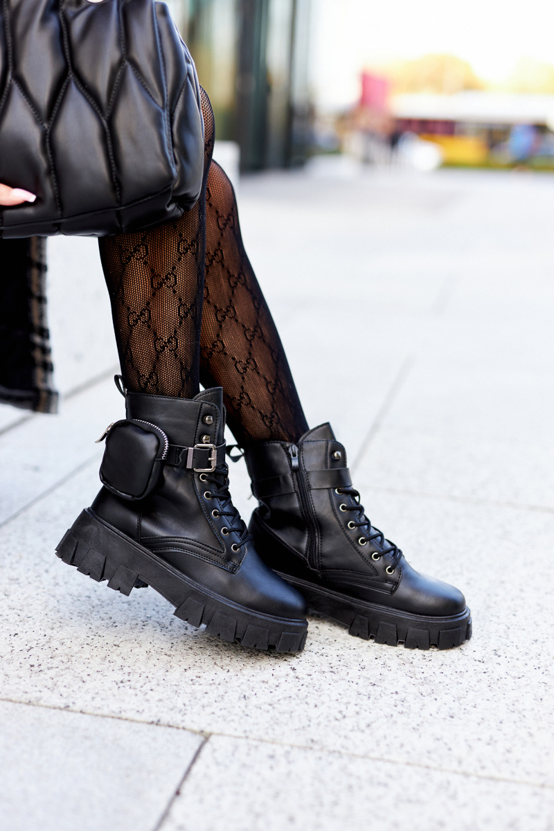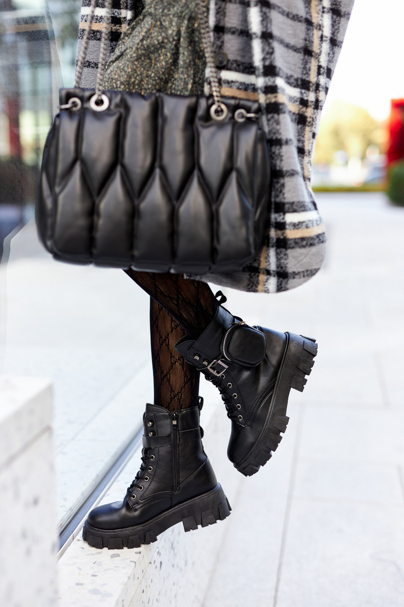 Modne botki z kieszonką zapinaną na suwak. Przyczepiony do botka za pomocą paska na sprzączce. Zapinane na suwak oraz wiązane. Idealnie skomponują się ze spódniczkami czy spodniami. Ocieplane za pomocą delikatnego futerka. Wykonane z zewnątrz z eko skóry. Przy wyborze rozmiaru prosimy sugerować się tabelą rozmiarów. Pasek oraz torebka są odpinane.