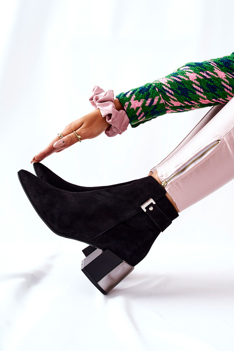 Botki z ozdobnym paseczkiem przypadną do gustu niejednej miłośniczce botków! Wykonane zostały z naturalnej zamszowej skóry. Dodatkowo w środku są ocieplone kocem obuwniczym. Posiadają suwak oraz masywny, efektowny obcas w postaci słupka. Nosek w szpic. Nie może ich zabraknąć w Twojej szafie! Przy wyborze rozmiaru prosimy sugerować się tabelą rozmiarów.