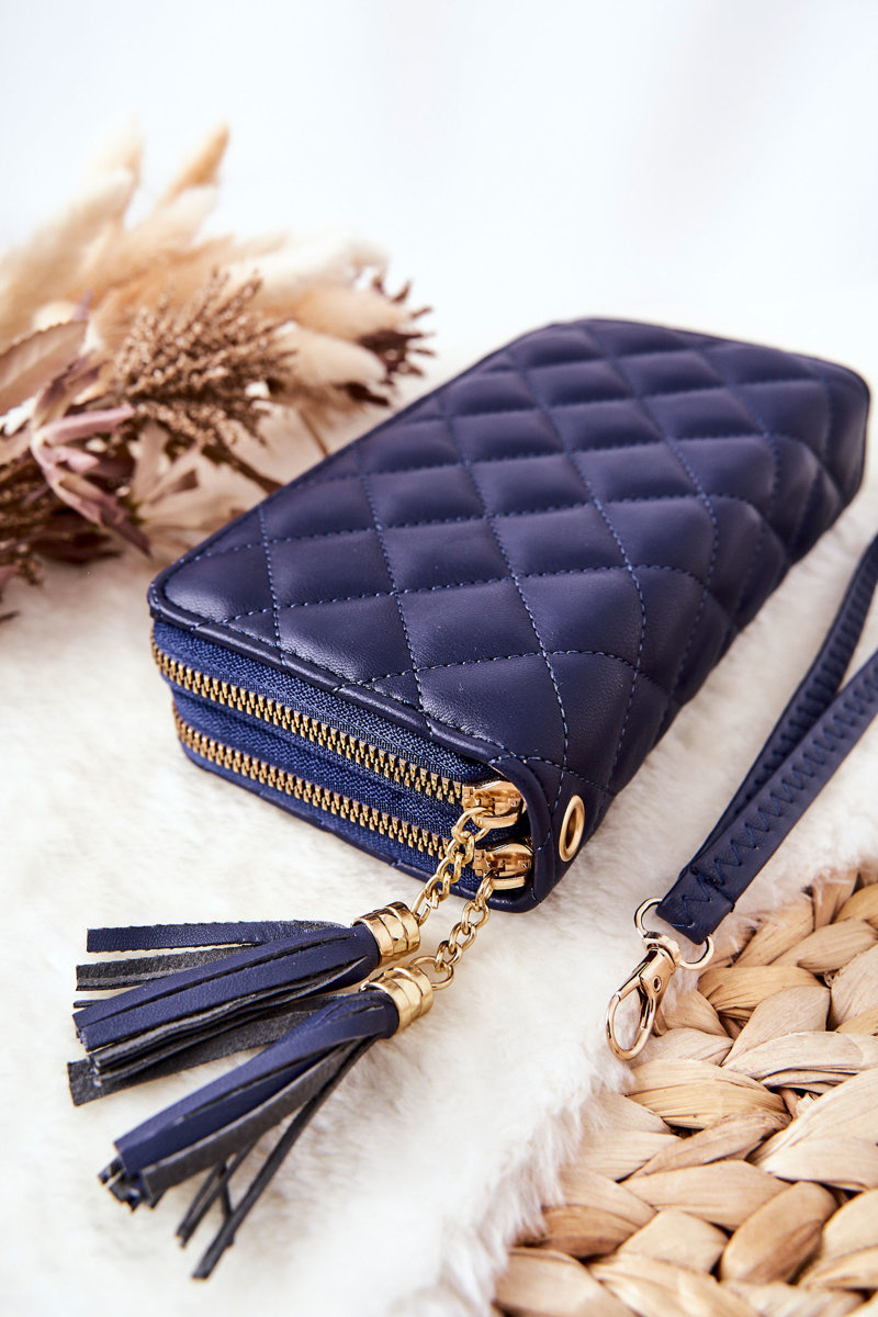 Duży i praktyczny portfel zapinany z zewnątrz na dwa zamki błyskawiczne. W jednej z przegródek można znaleźć miejsce na bilony, banknoty oraz wizytówki, natomiast w drugiej można umieścić niewielkiego smartfona lub banknoty czy dokumenty. Z zewnątrz portfel został wykonany z pikowanej eko skóry, a przy zamkach znajdują się frędzelki. Dodatkowo w zestawie jest dołączony paseczek.