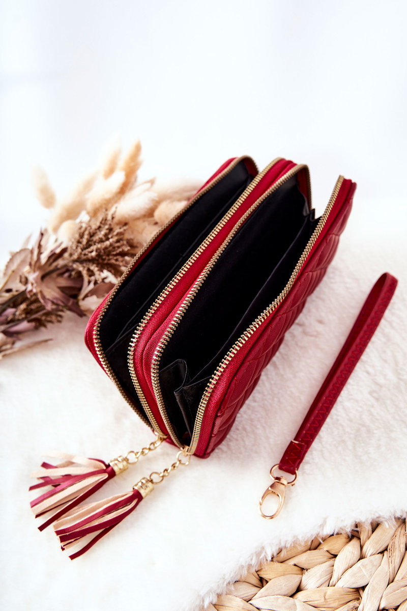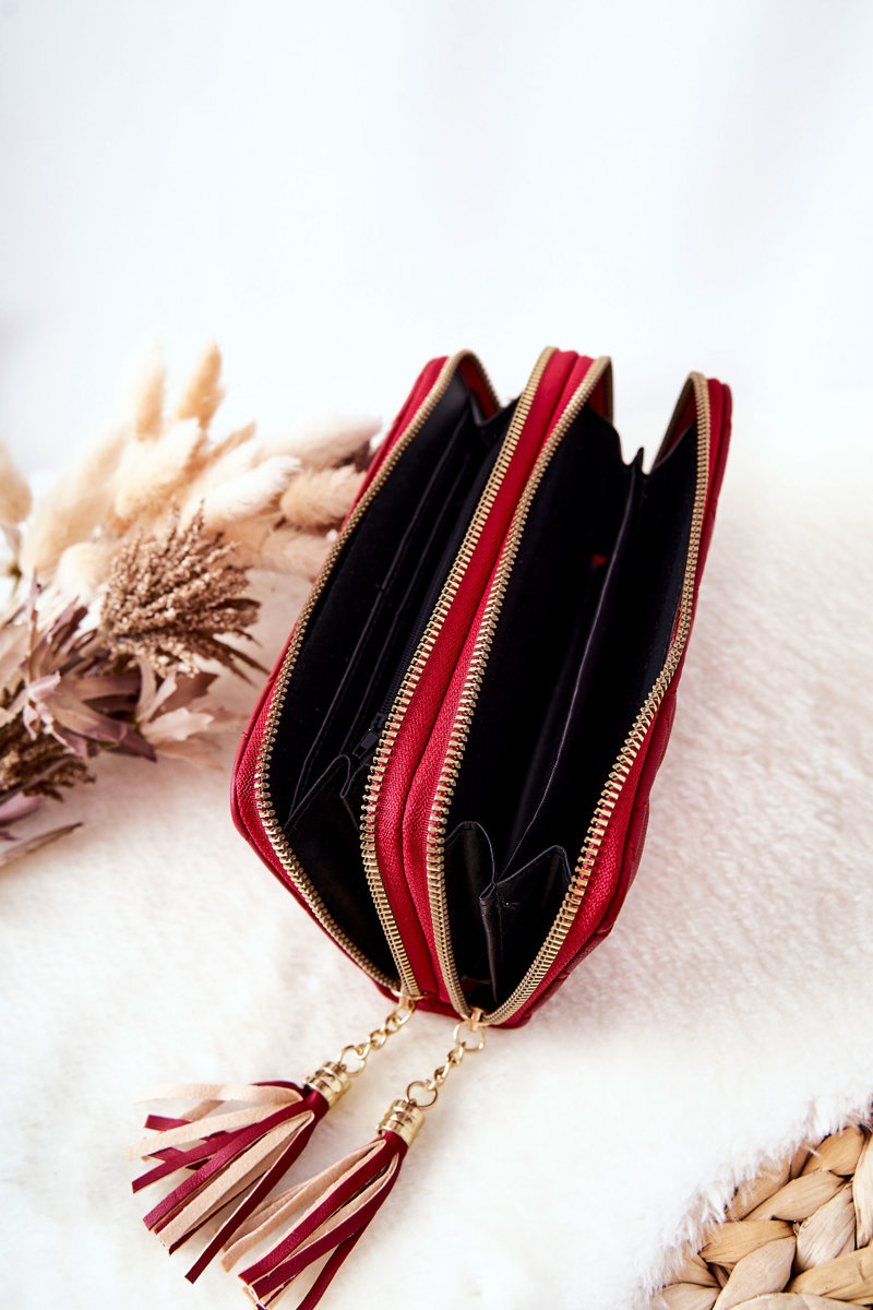 Duży i praktyczny portfel zapinany z zewnątrz na dwa zamki błyskawiczne. W jednej z przegródek można znaleźć miejsce na bilony, banknoty oraz wizytówki, natomiast w drugiej można umieścić niewielkiego smartfona lub banknoty czy dokumenty. Z zewnątrz portfel został wykonany z pikowanej eko skóry, a przy zamkach znajdują się frędzelki. Dodatkowo w zestawie jest dołączony paseczek.