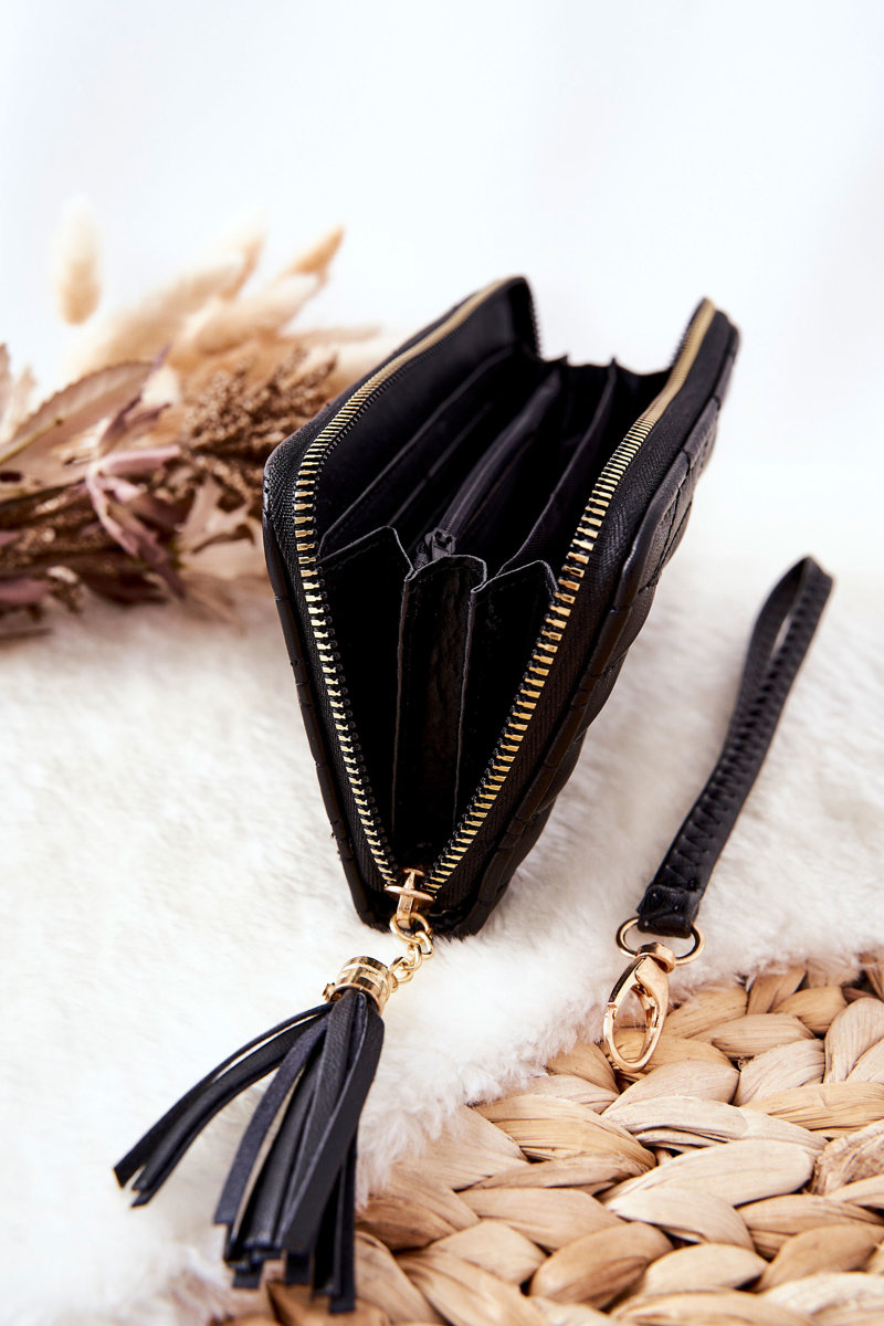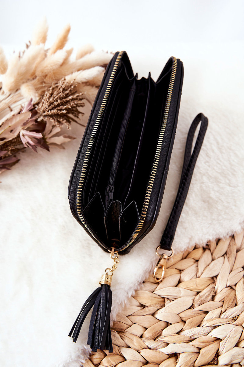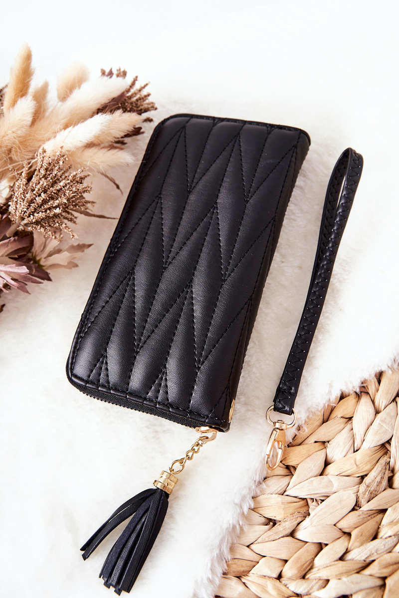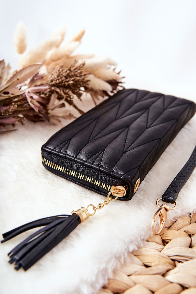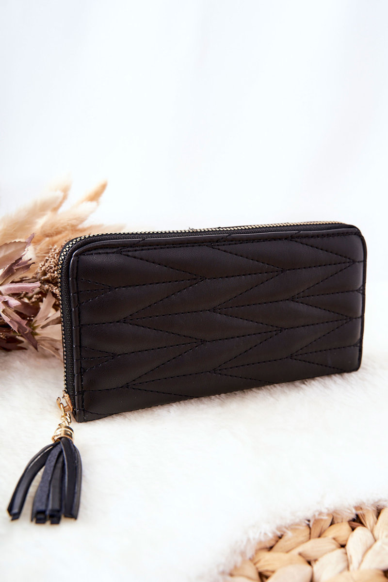 Duży Portfel Pikowany Na Suwak Z Paseczkiem Czarny