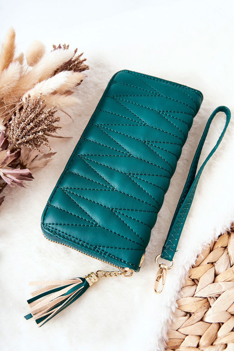 Duży Portfel Pikowany Na Suwak Z Paseczkiem Zielony