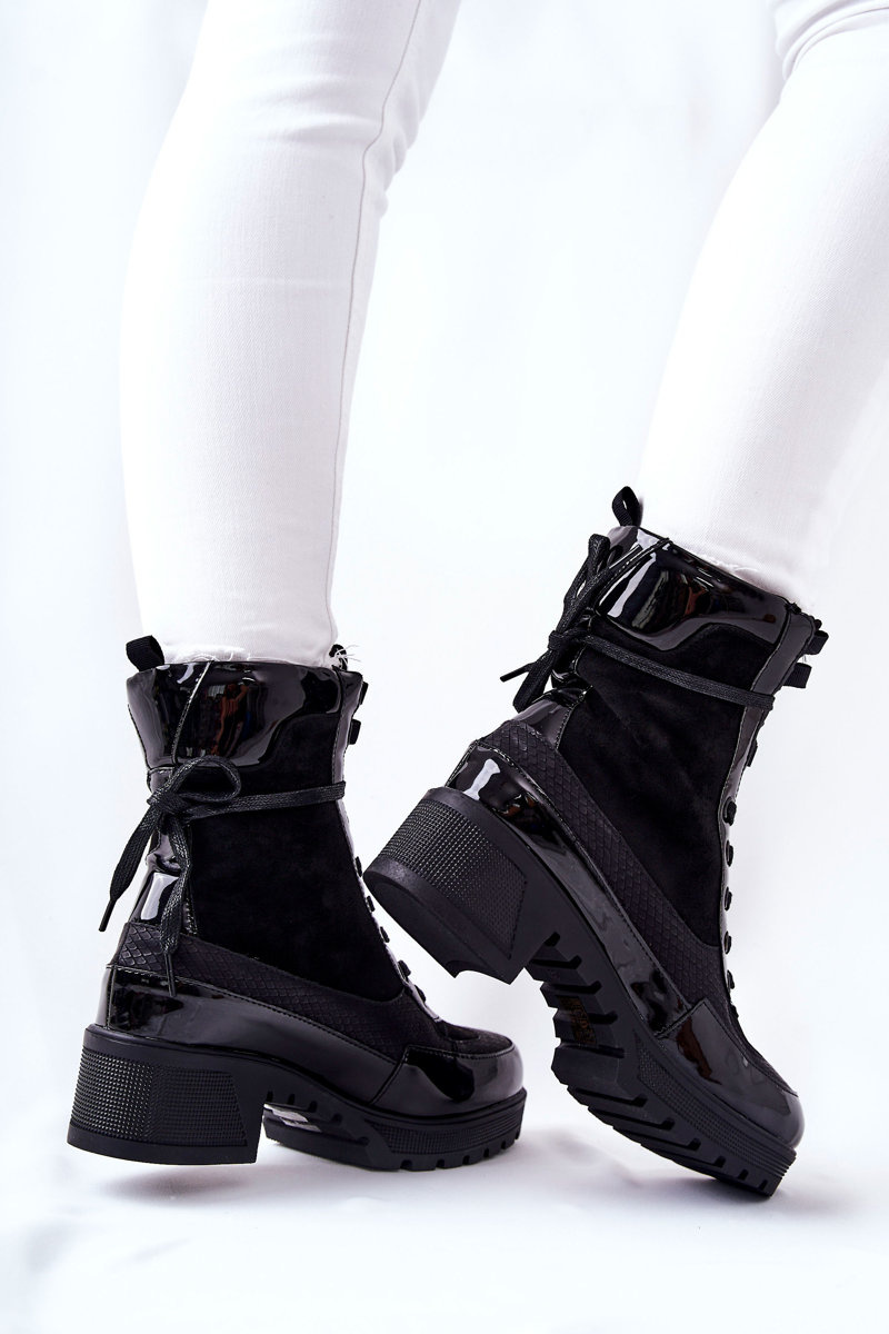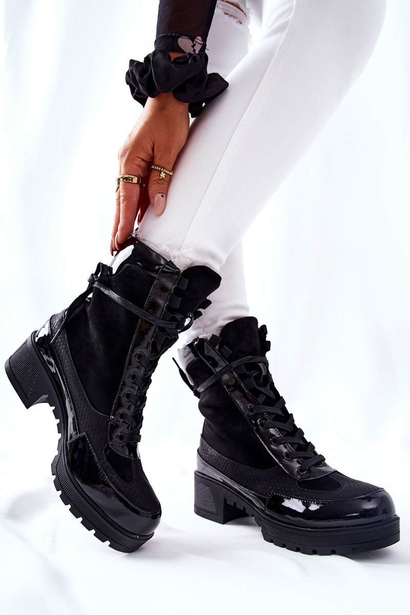 Botki wykonane z eko skóry, natomiast na górze cholewki oraz przy podeszwie są wykonane z lakierowanej eko skóry. Posiadają wiązanie. Delikatny obcas w postaci słupka subtelnie uniesie sylwetkę. Świetny model, który doda Twoim stylizacjom charakteru! Musisz je mieć! Przy wyborze rozmiaru prosimy sugerować się tabelą rozmiarów.