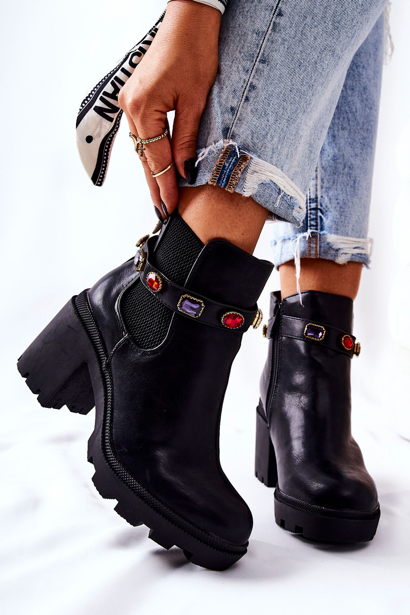 Skórzane Botki Damskie Na Słupku Z Kryształami Czarne Makbet