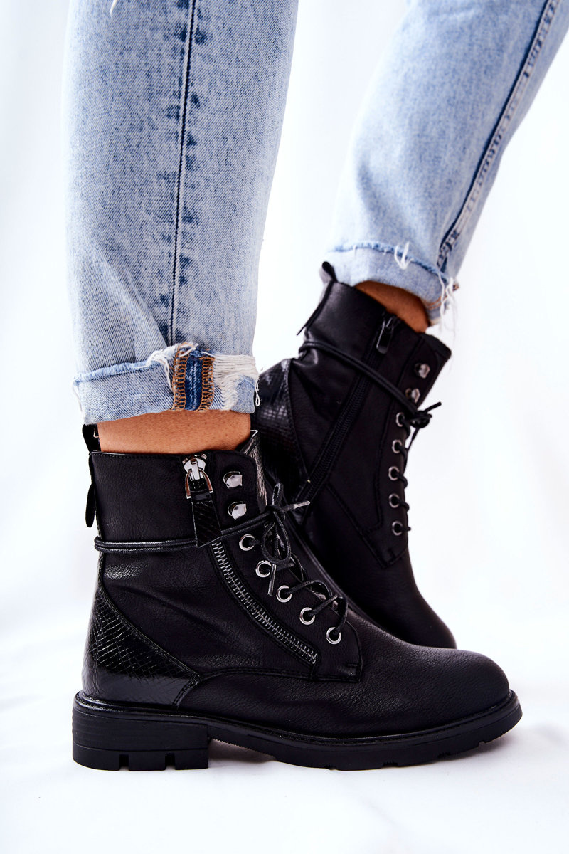 Botki wykonane zostały z eko skóry. Posiadają wiązanie oraz dwa zamki błyskawiczne - jeden ozdobny, drugi ułatwiający zakładanie obuwia. W środku posiadają ocieplenie w postaci miłego w dotyku koca obuwniczego. Świetnie sprawdzą się podczas jesiennych stylizacji z woskowanymi spodniami bądź spódniczkami. Koniecznie musisz je mieć! Przy wyborze rozmiaru prosimy sugerować się tabelą rozmiarów.
