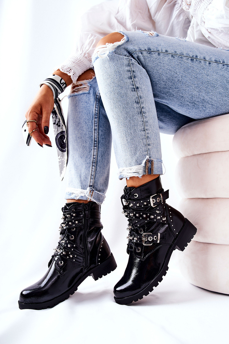 Model ten został wykonany ze skóry ekologicznej. Cholewka zdobiona paskami z klamrami oraz cekinami. Wnętrze buta ocieplone zostało ciepłym i miłym w dotyku kocem obuwniczym. Botki są zapinane na zamek błyskawiczny oraz wiązane. Nie może zabraknąć ich w Twojej garderobie! Kup już dziś! Przy wyborze rozmiaru prosimy sugerować się tabelą rozmiarów.