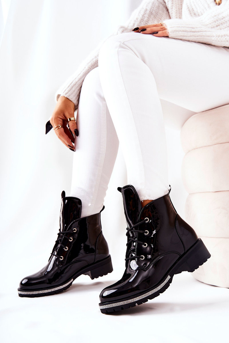 Eleganckie botki z lakierowanej skóry ekologicznej. Wnętrze pokryte jest ciepłym i miłym w dotyku kocem obuwniczym - gwarancja komfortu w każdej sytuacji. Na języku oraz przy podeszwie znajdują się ozdobne cyrkonie. Botki są wiązane. Koniecznie sprawdź całą naszą ofertę botków! Przy wyborze rozmiaru prosimy sugerować się tabelą rozmiarów.