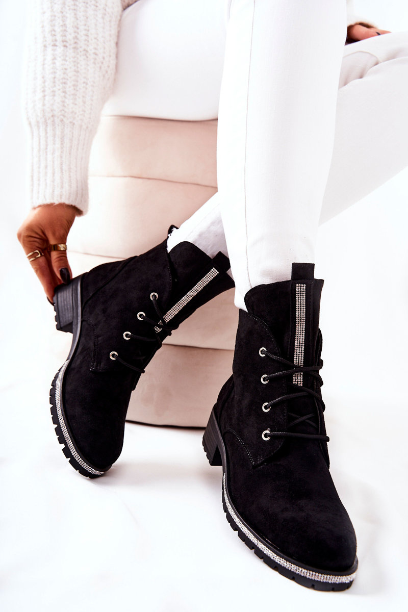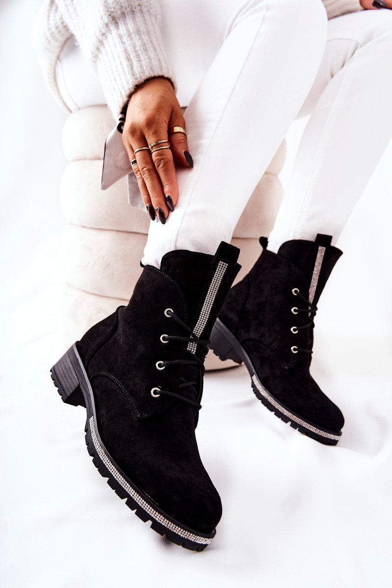 Eleganckie botki z zamszowej skóry ekologicznej. Wnętrze pokryte jest ciepłym i miłym w dotyku kocem obuwniczym - gwarancja komfortu w każdej sytuacji. Na języku oraz przy podeszwie znajdują się ozdobne cyrkonie. Botki są wiązane. Koniecznie sprawdź całą naszą ofertę botków! Przy wyborze rozmiaru prosimy sugerować się tabelą rozmiarów.