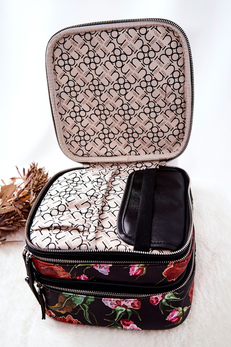 Kosmetyczka została wykonana z ekoskóry w piękny print. Może pełnić także funkcję kuferka. Posiada trzy suwaki, dzięki którym mamy wygodny dostęp do zawartości. W górnej komorze znajduje się otwarta kieszeń z gumką oraz osobna gumka podtrzymująca kosmetyki. W środkowej komorze można luźno umieścić różne, małe przedmioty. Dolna kieszeń jest głębsza od środkowej i również nie posiada kieszonek ani gumek, jak środkowa komora. Całość w środku jest obszyta materiałem w logo marki NOBO.