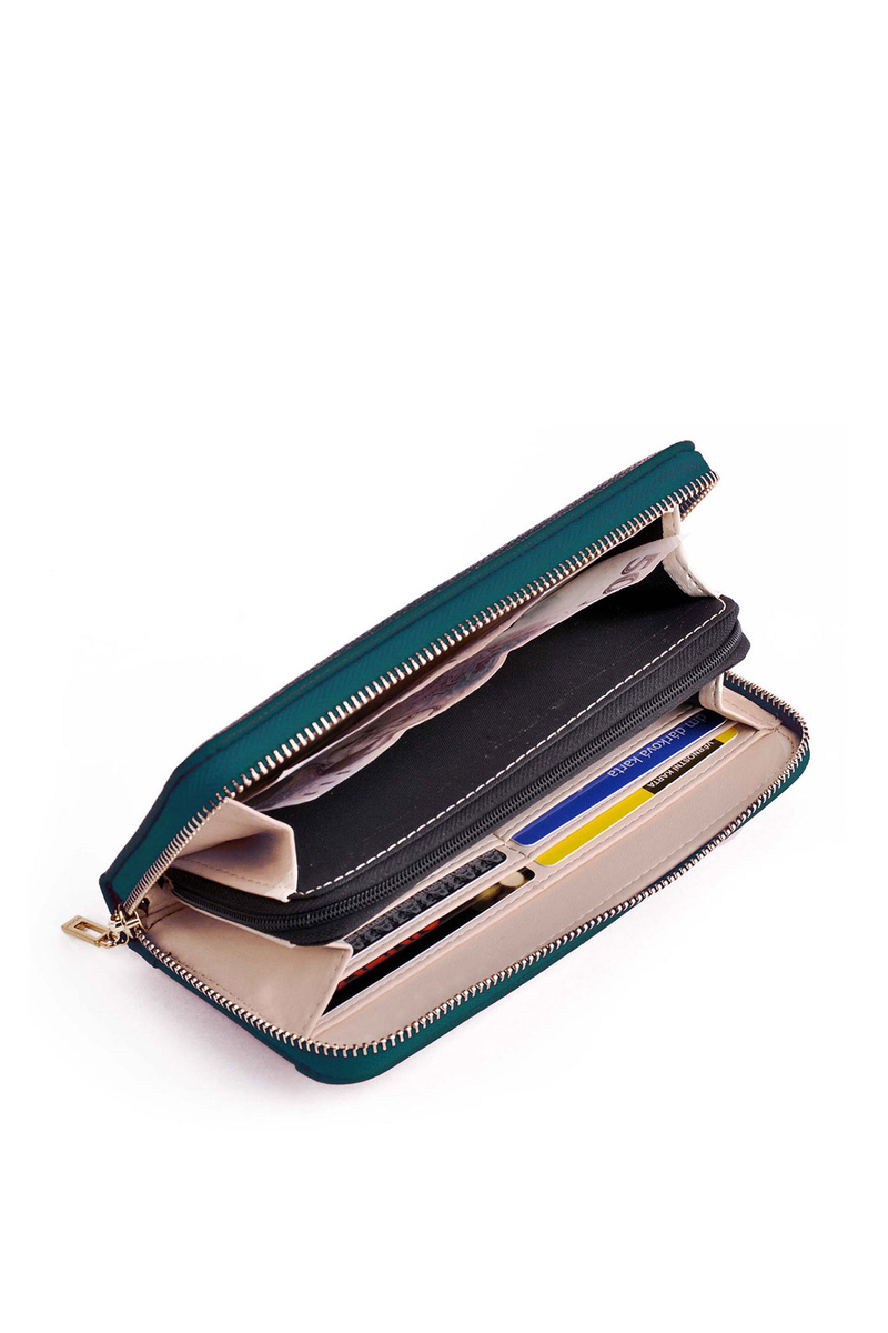 Duży portfel wykonany z eko skóry. Z przodu posiada emblemat, natomiast z tyłu znajduje się kieszonka zapinana na suwak. Dodatkowo do portfela jest dołączony paseczek. W środku posiada miejsce na wizytówki oraz banknoty, a także kiszonkę zapinaną na suwak. Piękny, klasyczny portfel dostępny w wielu modnych kolorach. Musisz go mieć!