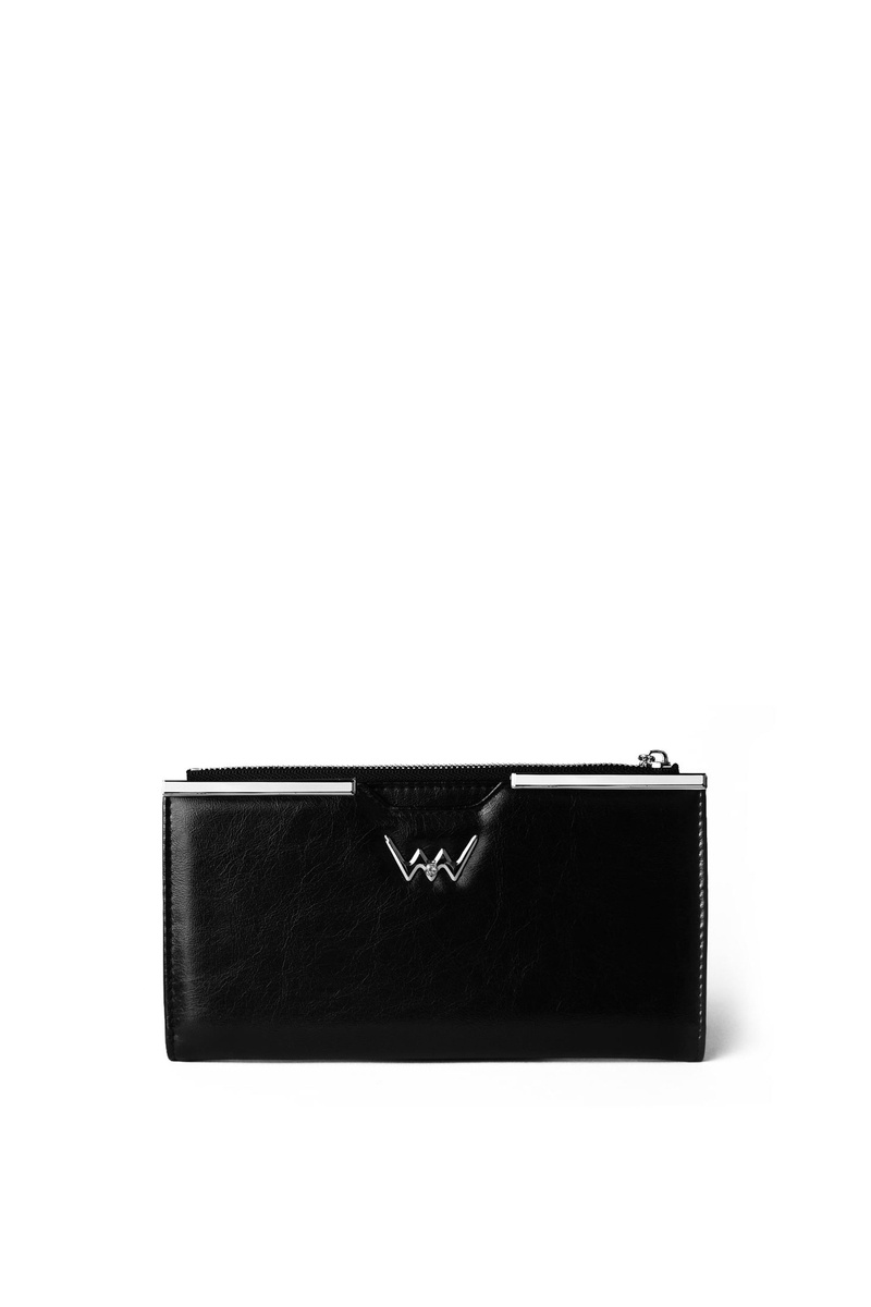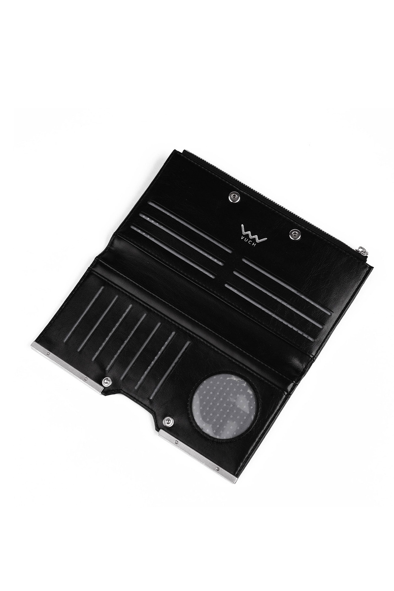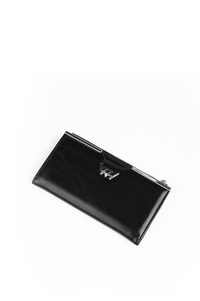 Ten portfel zachwyci niejedną miłośniczkę wyjątkowych modowych akcesoriów! Elegancki portfel został wykonany z eko skóry. Na przodzie widnieje emblemat z ozdobną cyrkonią. Z tyłu natomiast znajduje się otwarta kieszeń, w której został umieszczony wyciągany wizytownik z miejscem na zdjęcie w innym kolorze niż portfel. Część zapinana na napy także zawiera miejsce na wizytówki czy dowód osobisty oraz zdjęcie. Kieszonka zapinana na suwak pomieści monety.
