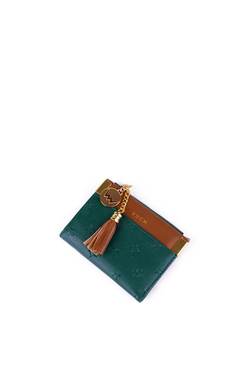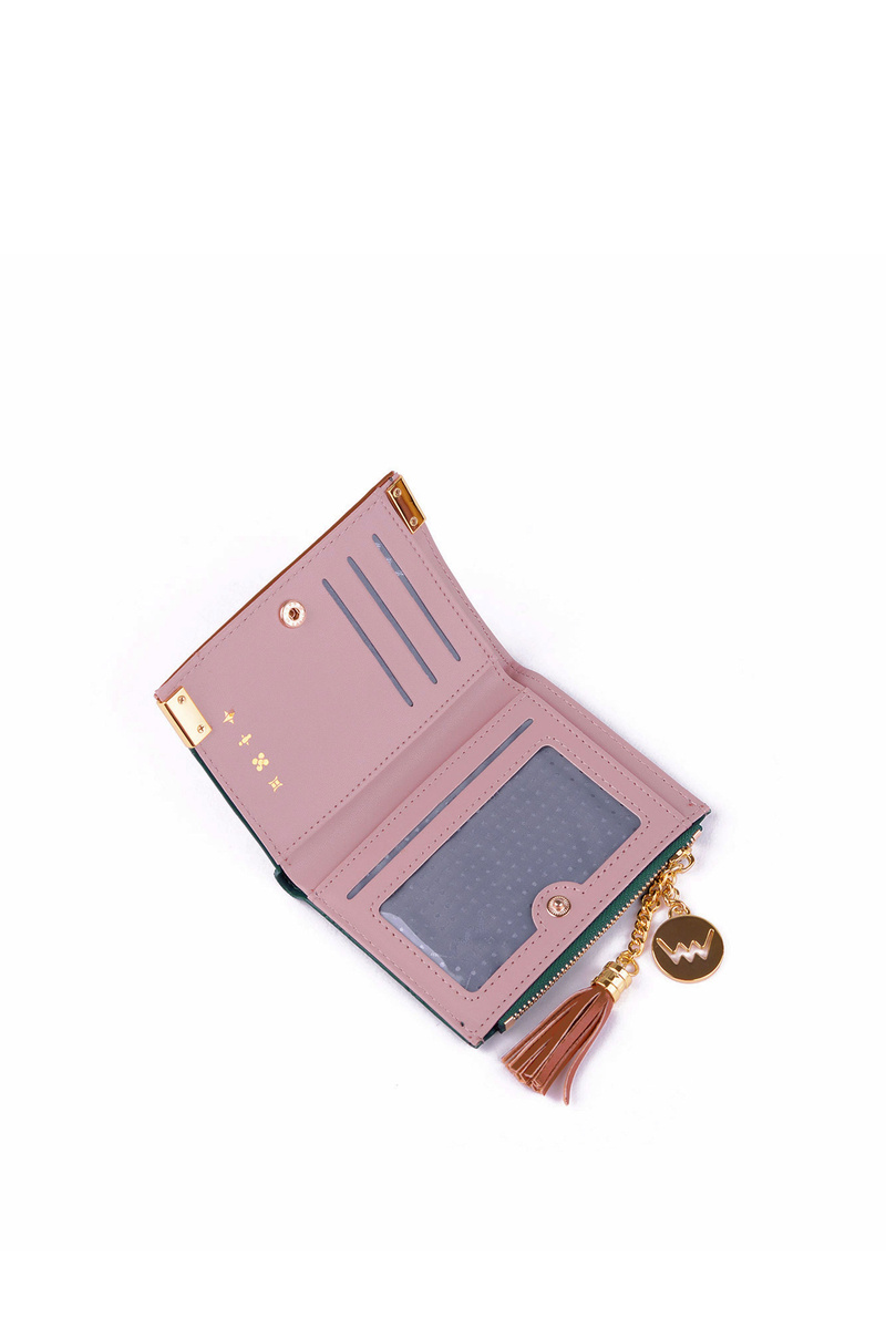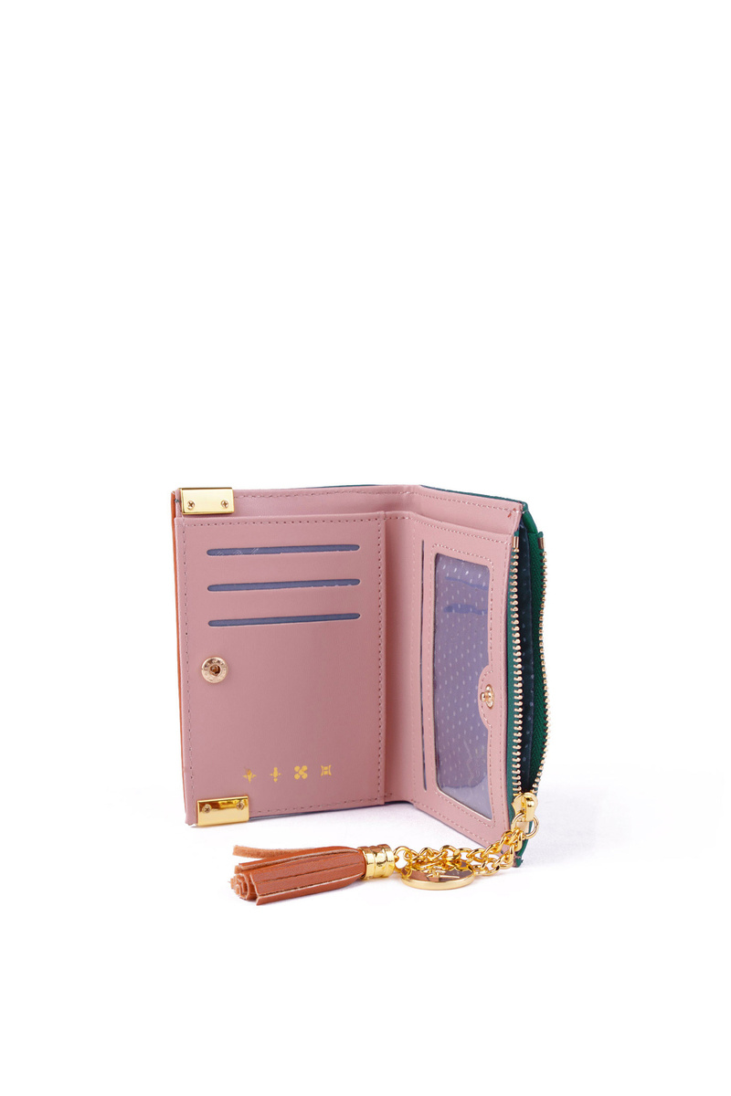 Mały portfel przyda się każdemu! Jest praktyczny, a przede wszystkim zachwyca swym wyglądem! Wykonany z eko skóry z zamykaniem na napy oraz suwak. Posiada miejsce na banknoty, fotografię oraz wizytówki czy karty kredytowe. Przy suwaku znajduje się frędzelek oraz emblemat, a kieszonka umożliwi przechowywanie bilonów.
