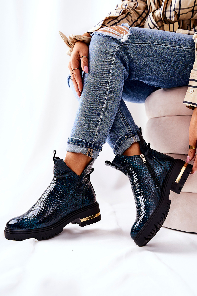 Skórzane Botki Ocieplane Krokodyl Zielone Tanya