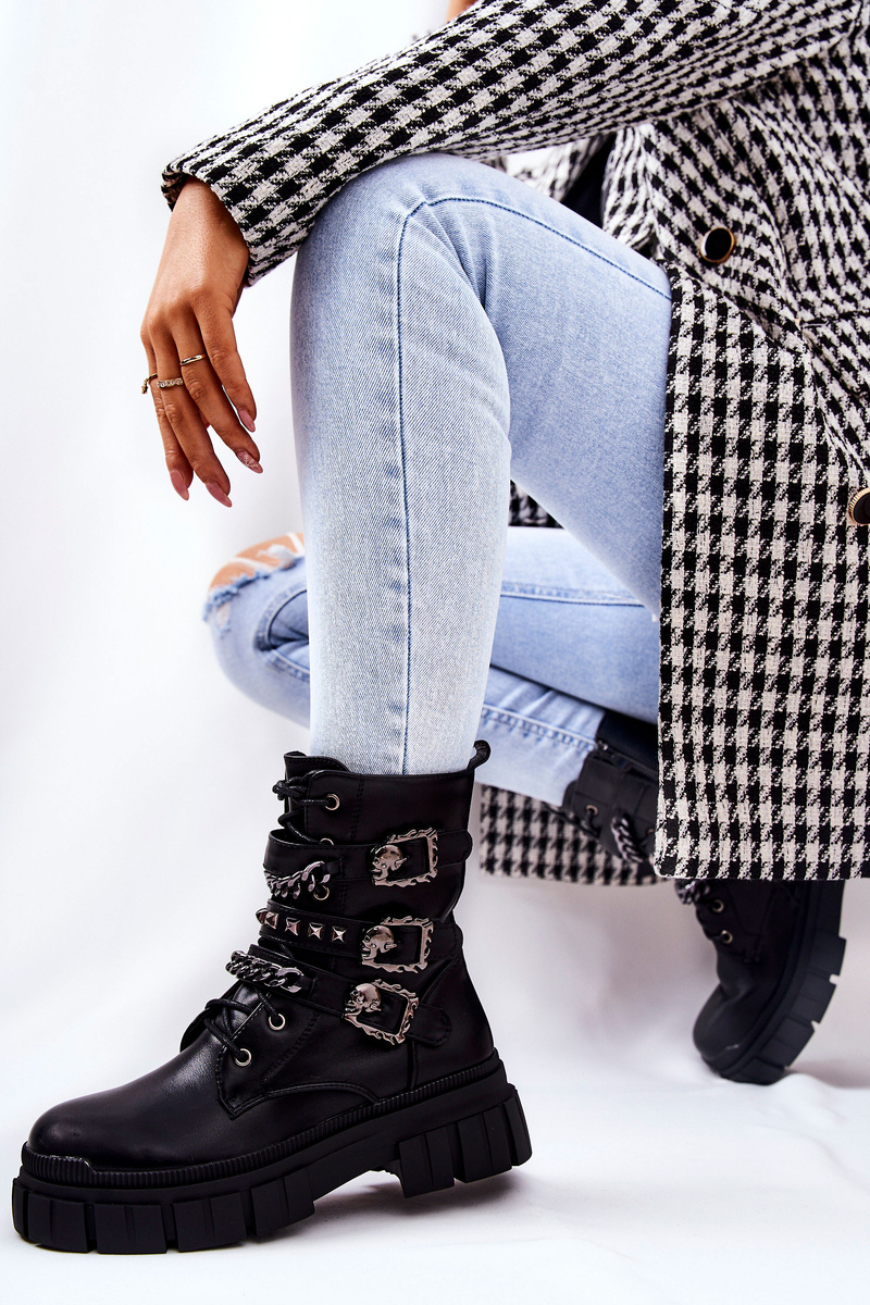 Botki Wiązane Łańcuch Sprzączka Czarne Reiloy