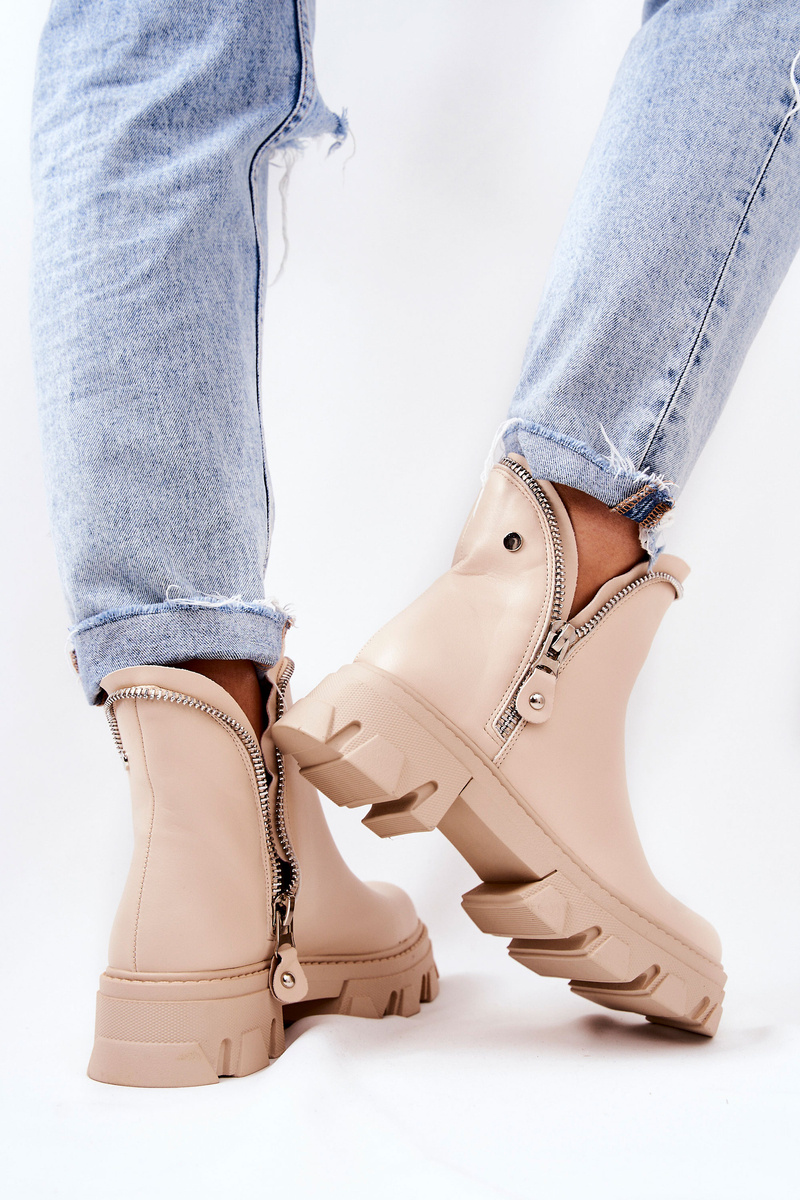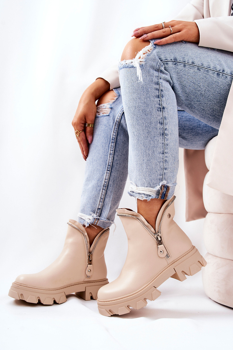 Skórzane Botki Ozdobne Suwaki Beżowe Deborah