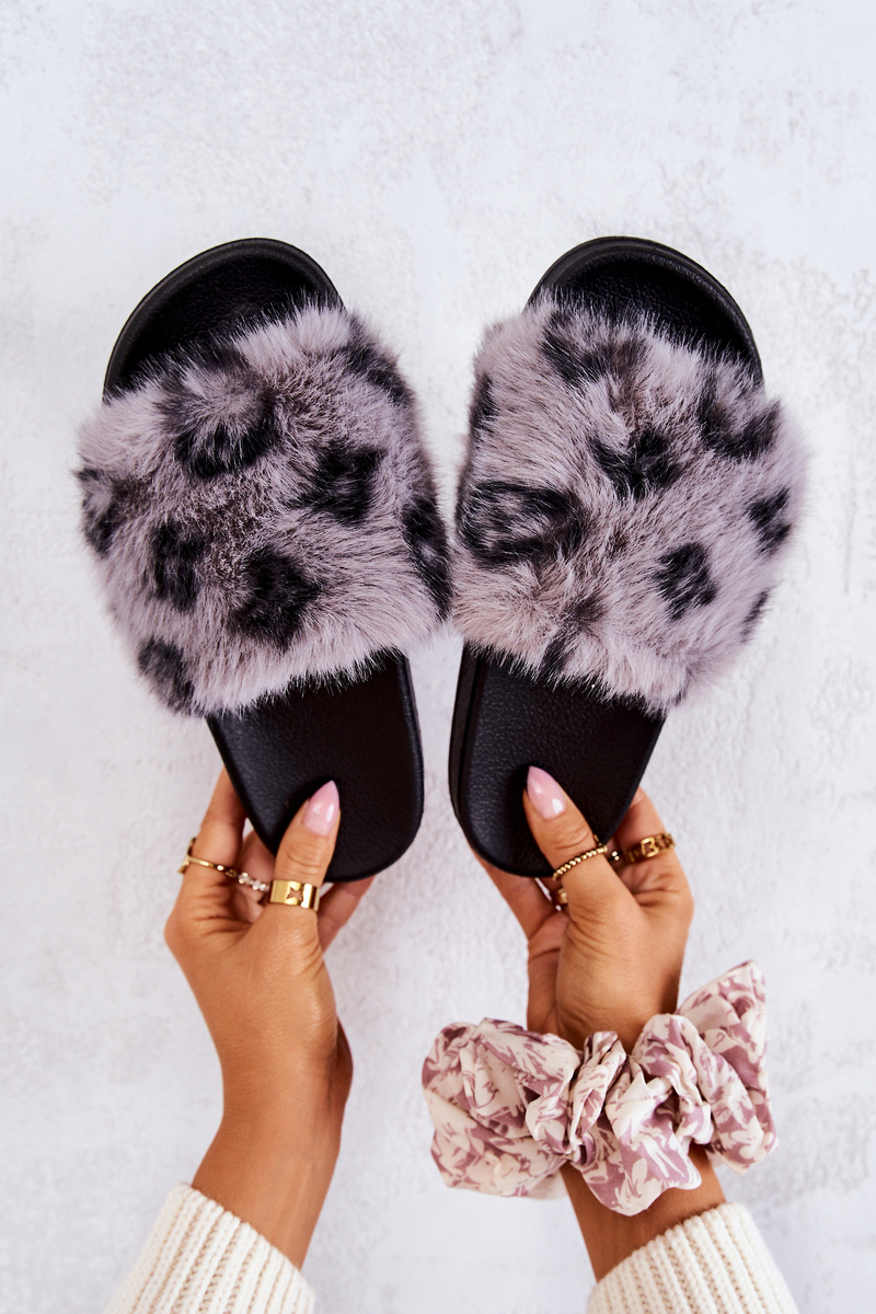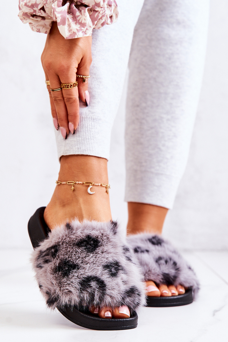 Klapki Z Futerkiem Gumowe Panterka Szare Noelle