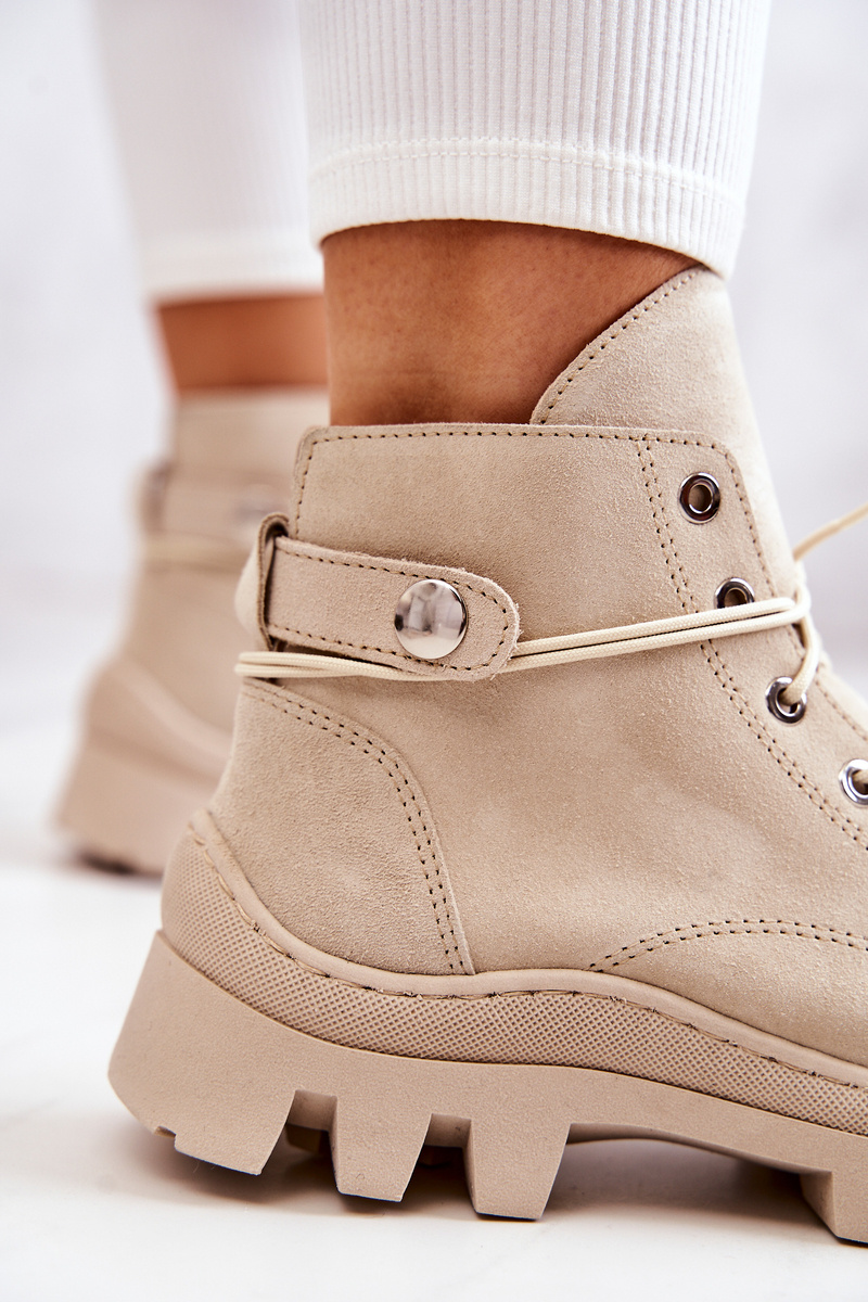 Botki zostały wykonane z naturalnej zamszowej skóry. Posiadają klasyczne wiązanie umożliwiające dopasowanie buta do tęgości nogi. Traperowa podeszwa świetnie sprawdzi się na nierównej nawierzchni. Wkładka jest wykonana z naturalnej skóry. Botki posiadają z tyłu paseczek zapinany na napy, który można odpiąć. Przy wyborze rozmiaru prosimy sugerować się tabelą rozmiarów.