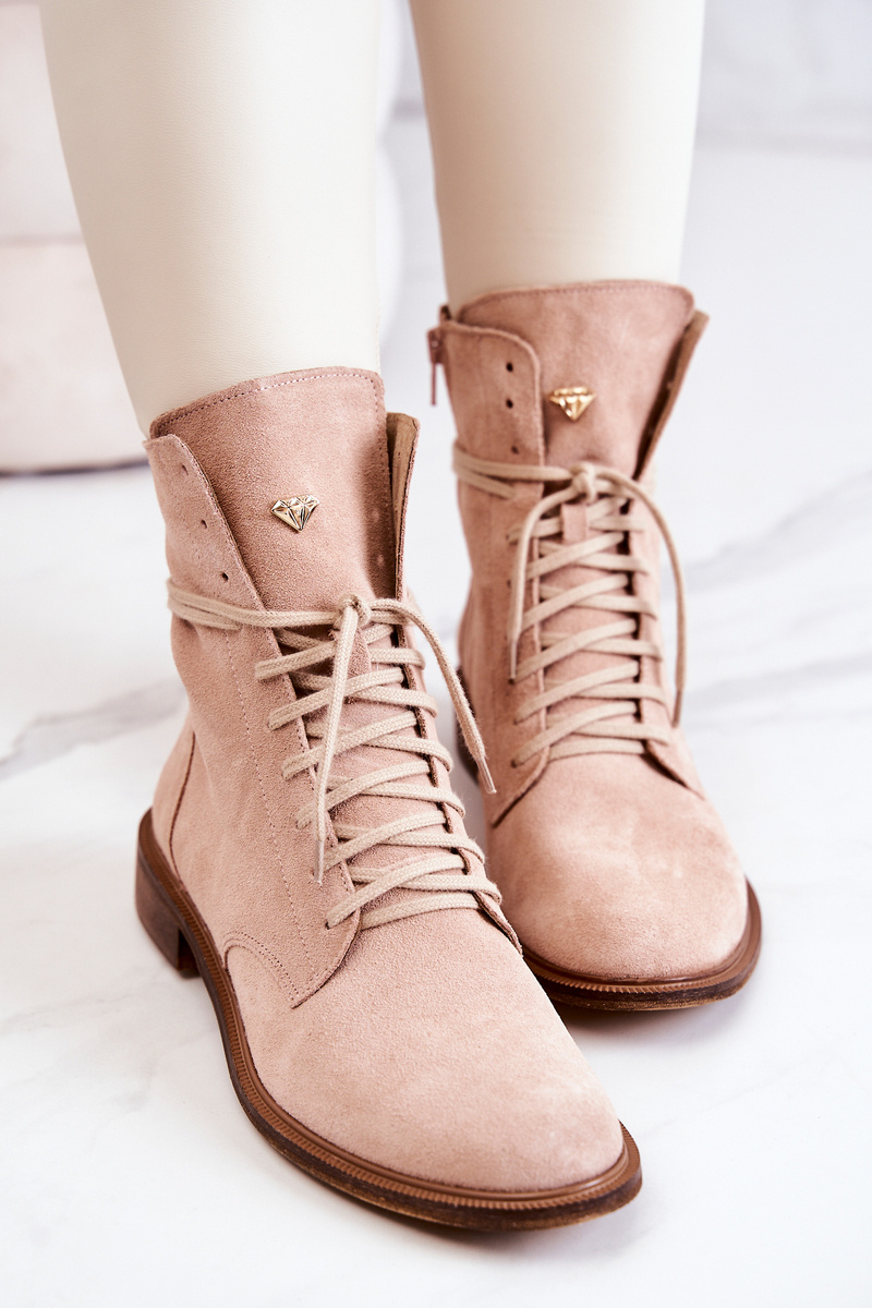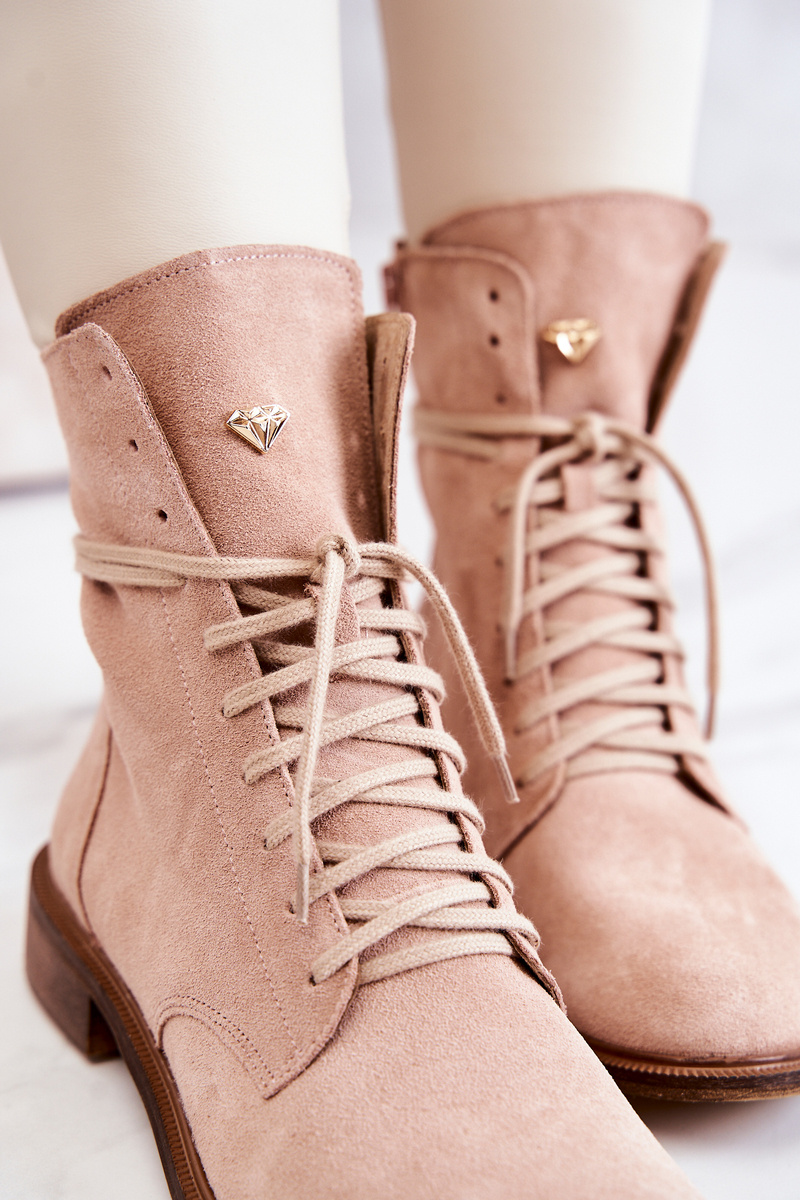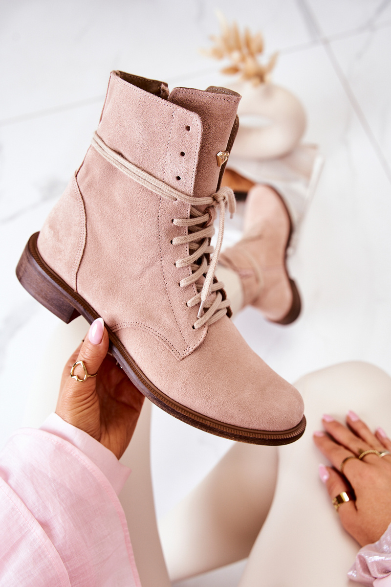 Buty zostały wykonane z naturalnego zamszu. Zdobienie na języku pięknie podkreśla ich wyjątkowy styl. Zakładanie ułatwi wszyty na boku suwak, natomiast o lepsze dopasowanie zadbają sznurowadła. Botki oparte na delikatnym płaskim obcasie. W środku znajduje się skórzana wkładka, która zadba o Twój komfort. Przy wyborze rozmiaru prosimy sugerować się tabelą rozmiarów.
