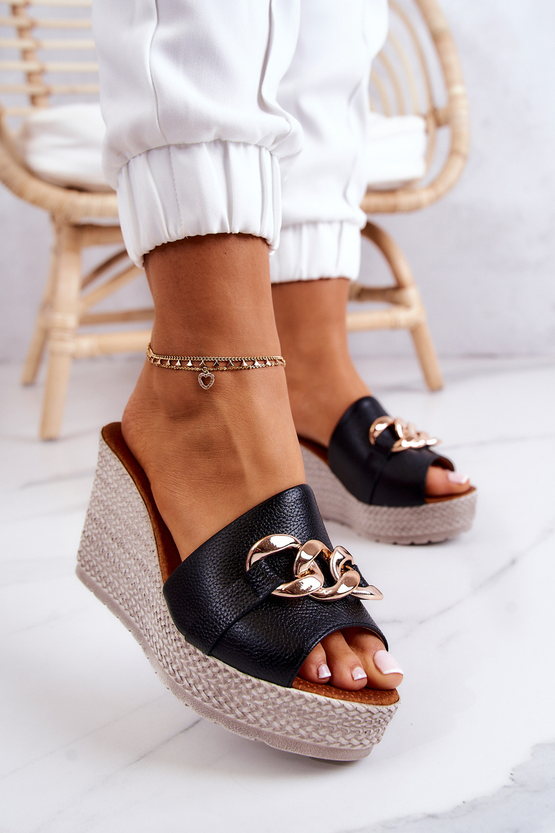 Skórzane Klapki Na Koturnie Lewski 3062 Czarne