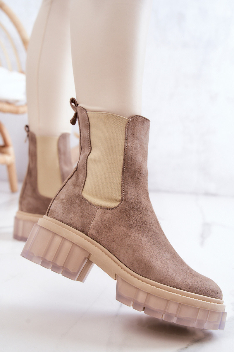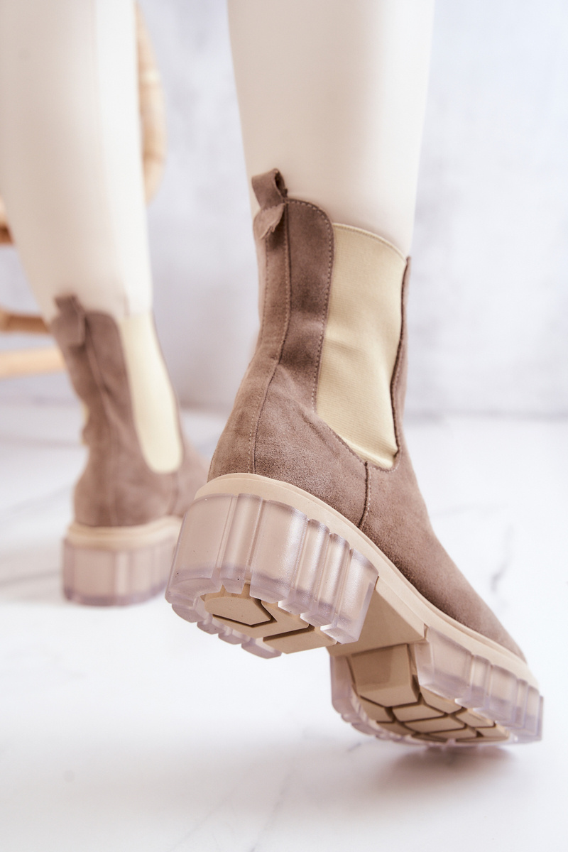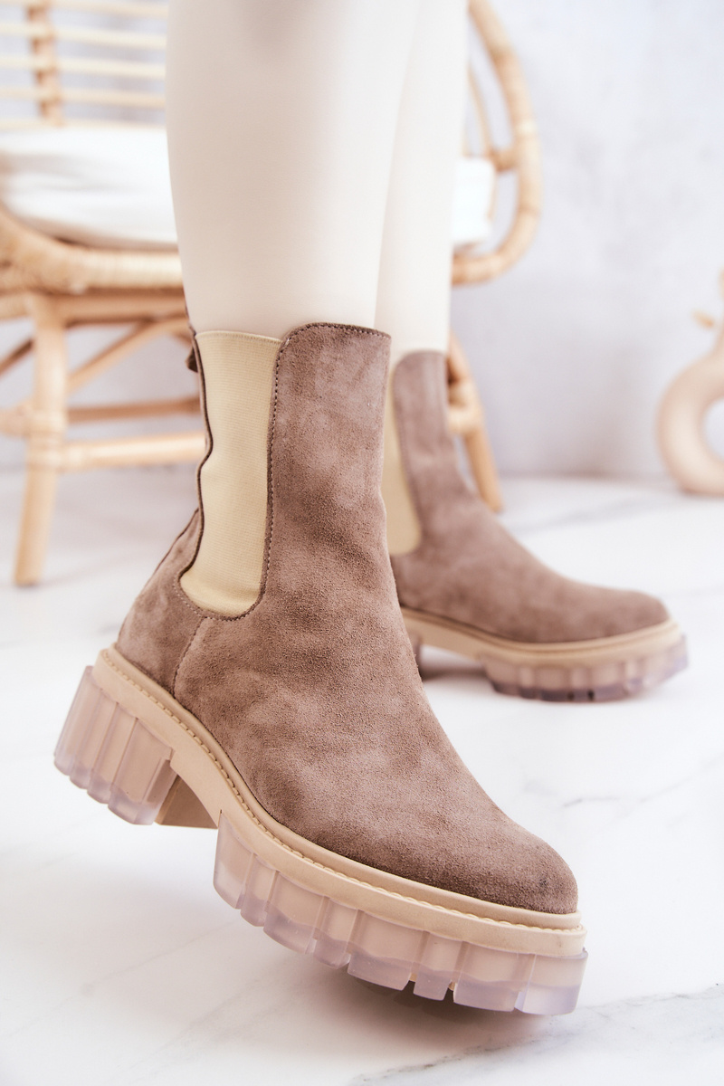 Botki na masywnej platformie z szerokim obcasem w stylu sztybletów. Posiadają wysoką, sięgającą ponad kostkę cholewkę. Wykonane z naturalnej zamszowej skóry. Posiadają dodatkową, elastyczną wstawkę, dzięki której cholewka świetnie dopasuje się do tęgości nogi. Boki podeszwy są ozdobione przezroczystym, gumowym tworzywem. Przy wyborze rozmiaru prosimy kierować się tabelą rozmiarów