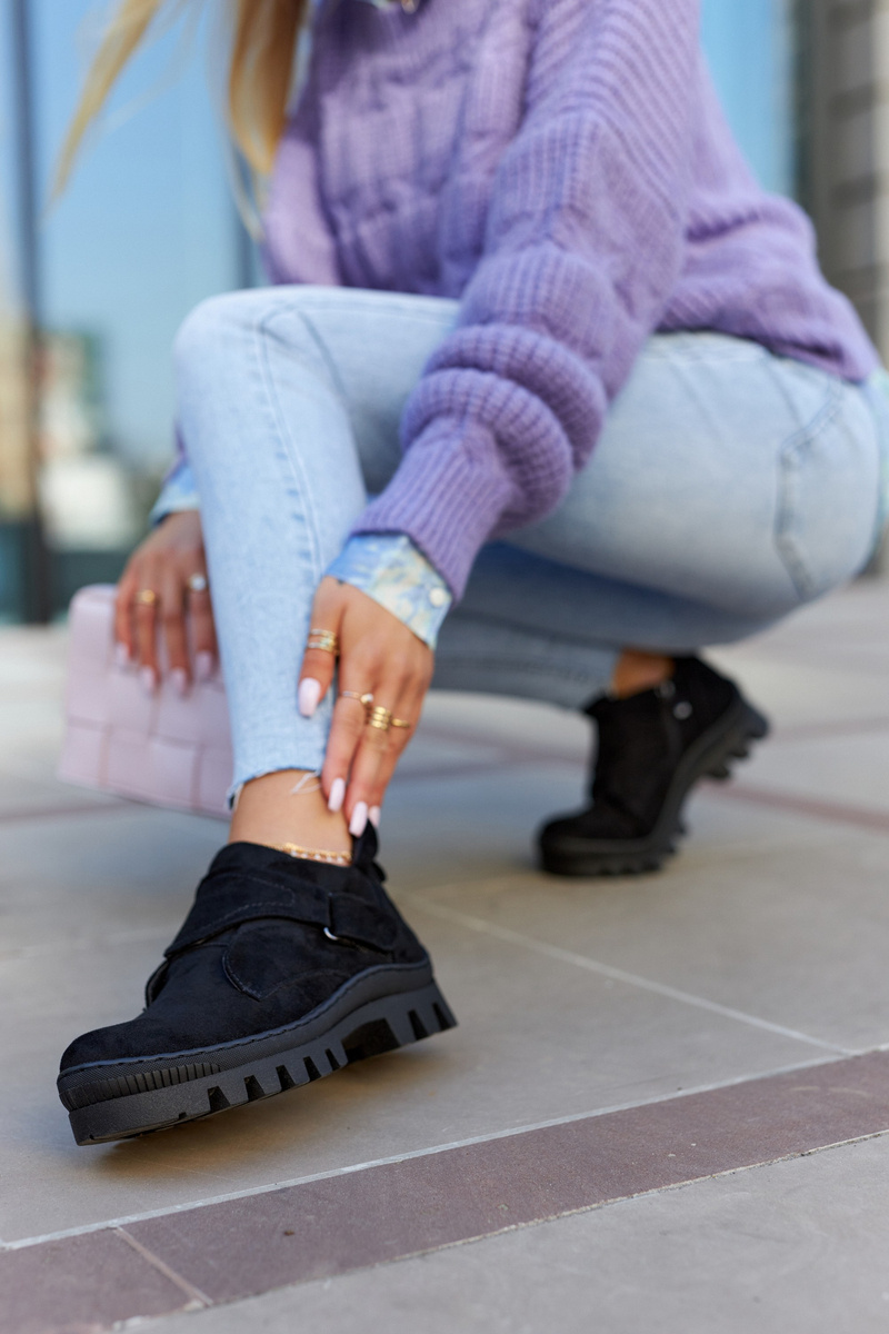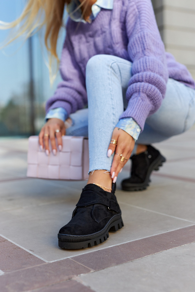 Traperki na grubej podeszwie z wysokim bieżnikiem. Cholewka wykonana z eko zamszu z suwakiem z boku oraz dodatkowym rzepem. Buty posiadają okrągły nosek. Z tyłu cholewki znajduje się bootstrap, czyli pętelka ułatwiająca zakładanie oraz ściąganie obuwia. Zapiętek jest usztywniany. Te trapery o nowoczesnym fasonie idealnie sprawdzą się w wiosennych stylizacjach! Przy wyborze rozmiaru prosimy sugerować się tabelą rozmiarów.