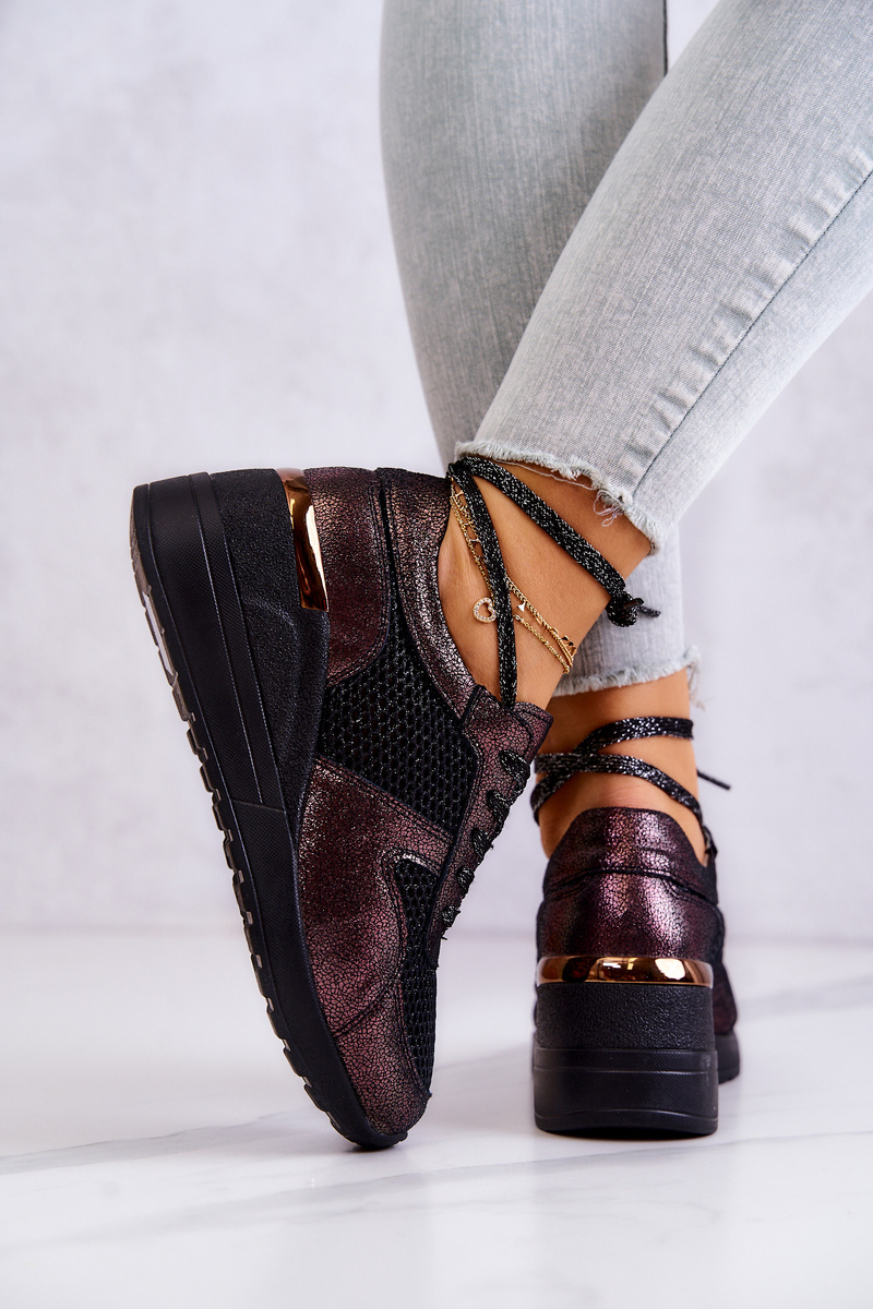 Skórzane Sneakersy Na Koturnie Z Siateczką S.Barski Czarne