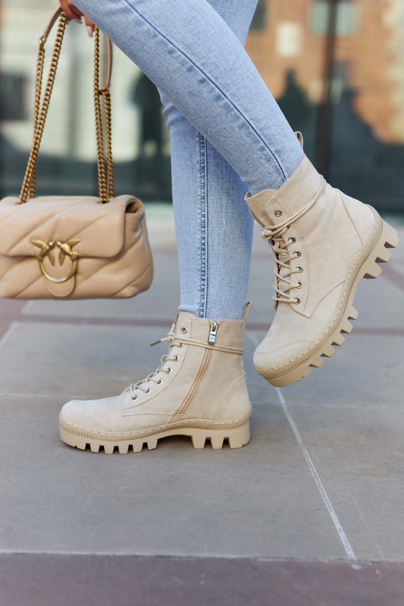 Botki osadzone na grubej platformie z wysokim bieżnikiem. Przód noska jest dodatkowo wzmocniony gumowym tworzywem. Zapinane po wewnętrznej stronie cholewki na zamek błyskawiczny, a także dodatkowo sznurowane. Wykonane z miękkiego eko zamszu z przeszyciem z boku. Usztywniany zapiętek. Stworzą świetny look z klasycznymi jeansami czy joggerami, a także dzianinową sukienką. Przy wyborze rozmiaru prosimy sugerować się tabelą rozmiarów.