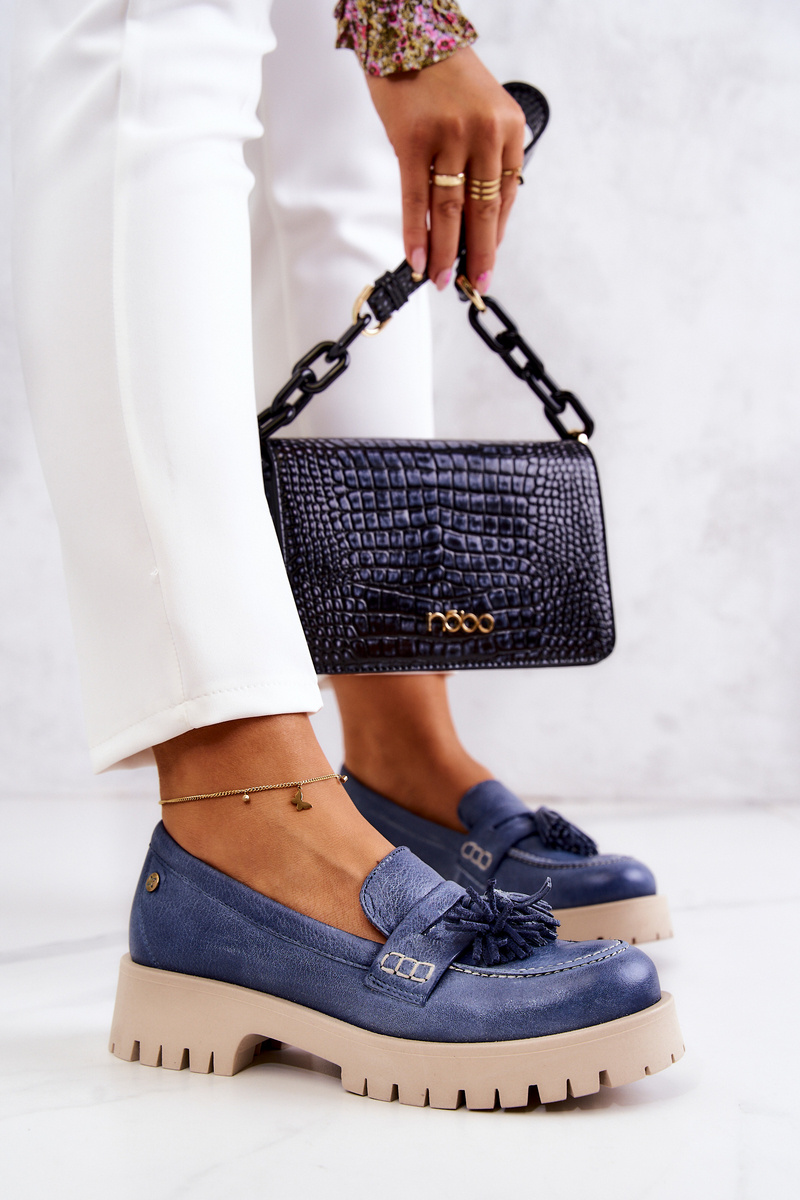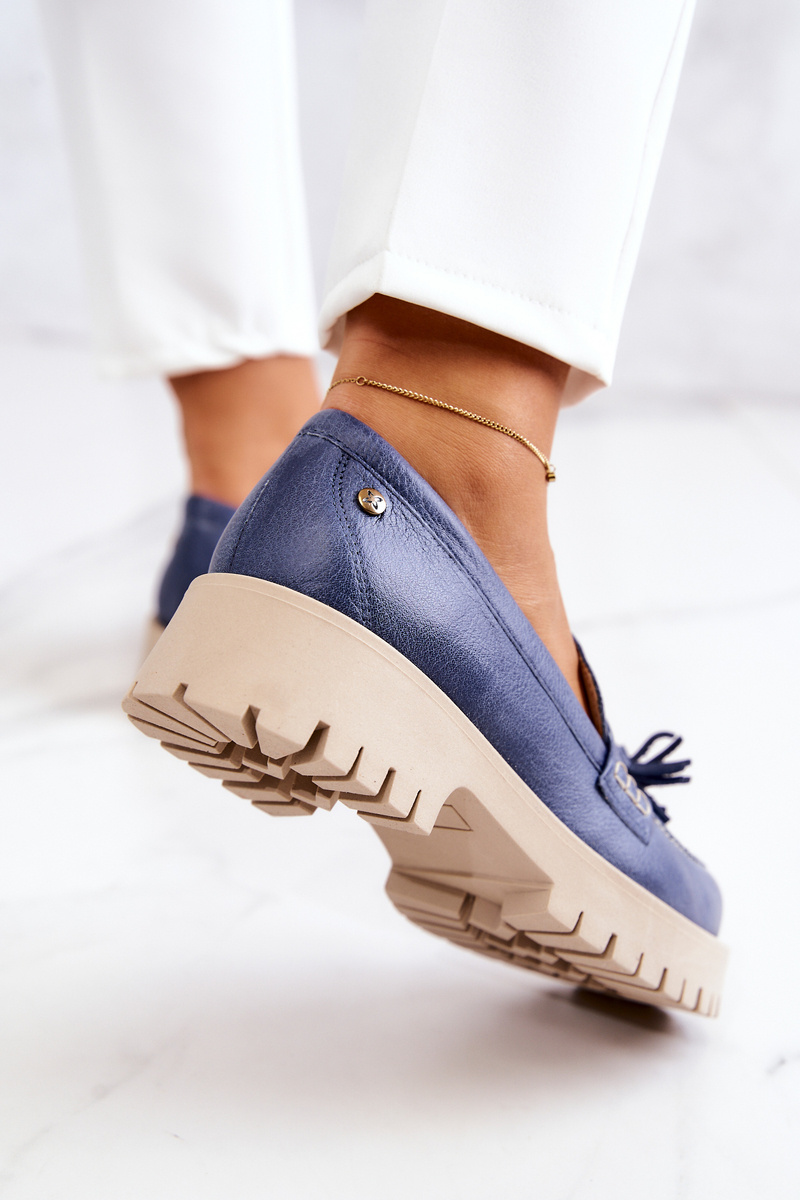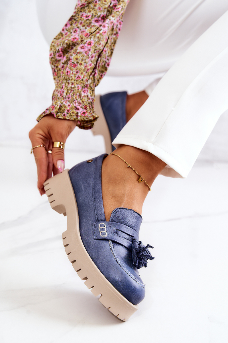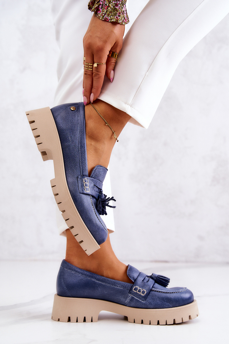 Damskie Skórzane Półbuty Frędzle Maciejka 05497-17 Niebieskie