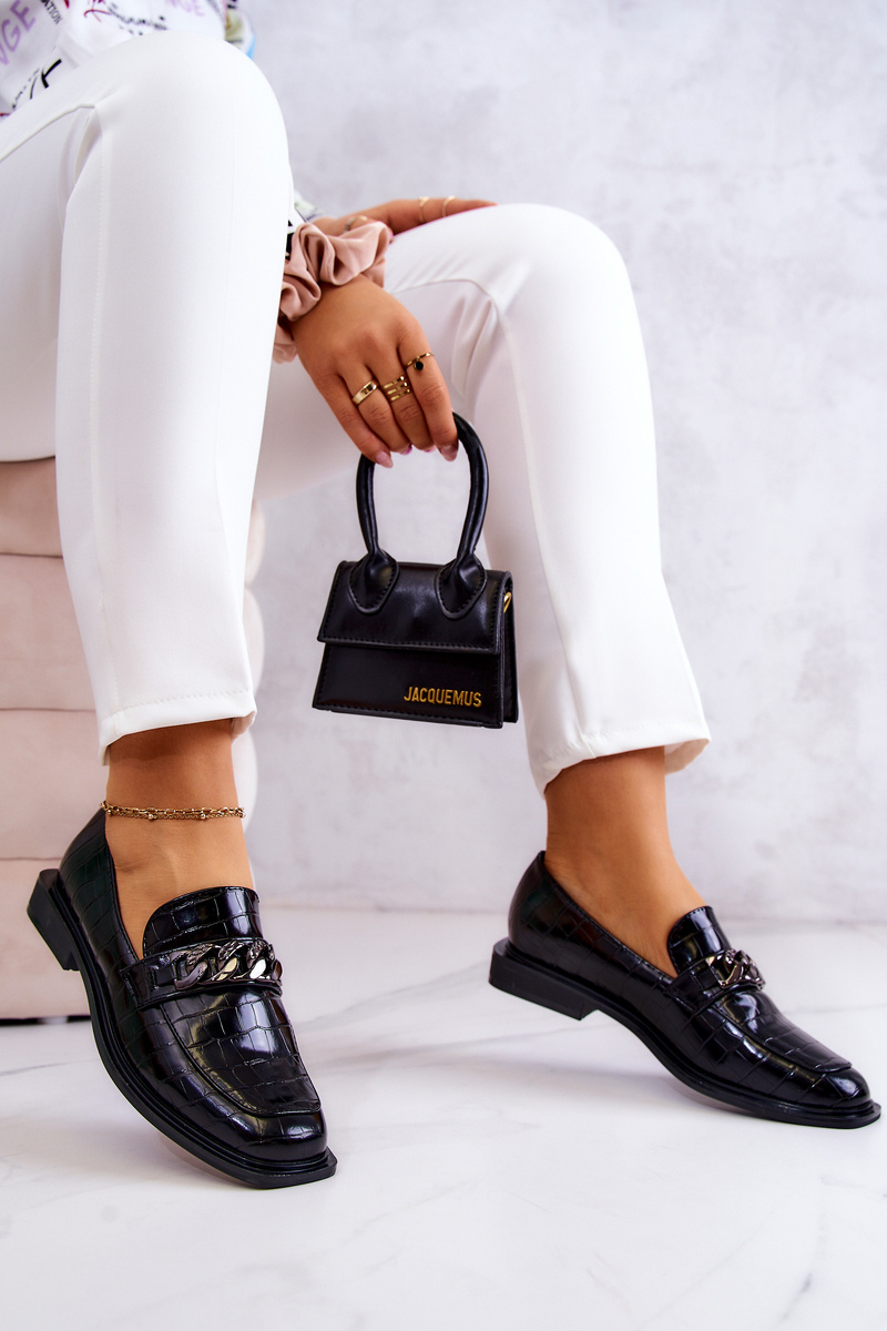 Mokasyny wsuwane, osadzone na płaskim obcasie. Nosek kwadratowy. Zdobione na górze łańcuchem z dodatkowym tłoczeniem. Wykonane z eko skóry. Mokasyny z łańcuchem to klasyka w nowoczesnym wydaniu. Buty posiadają wygodną wkładkę, która jest wykonana z naturalnej skóry. Świetny design, który idealnie wpisuje się w aktualne trendy! Będą idealne do pracy, na spotkania biznesowe czy różnego rodzaju uroczystości. Bardzo dobrze komponują się z eleganckimi spódnicami czy spodniami. Przy wyborze rozmiaru prosimy sugerować się tabelą rozmiarów.