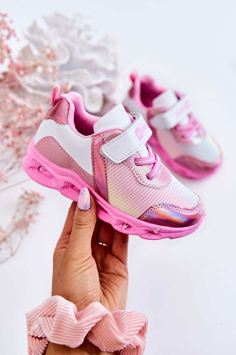 Lekkie i wygodne sportowe buty dziecięce. Model ten został wykonany z połączenie eko skóry i materiału tekstylnego. Holograficzne wstawki sprawiają, że buty wyglądają niezwykle wyjątkowo. Dodatkowo podeszwa została wykonana z piankowego tworzywa. Twoja pociecha na pewno będzie zadowolona z tych butów, gdyż z każdym krokiem podeszwa świeci się na kolorowo. Dopasowanie do stopy zapewni zapinanie na rzep. Buty posiadają także gumki imitujące sznurowadła. Miękka, materiałowa wkładka to gwarancja wygody. Przy wyborze rozmiaru prosimy sugerować się tabelą rozmiarów.