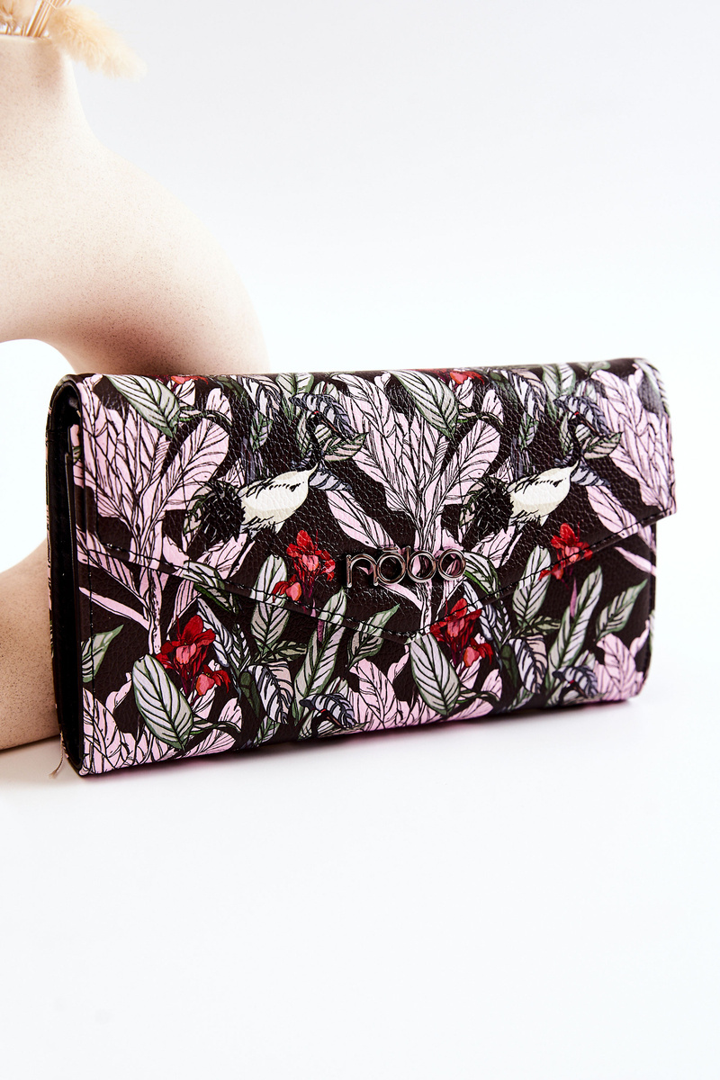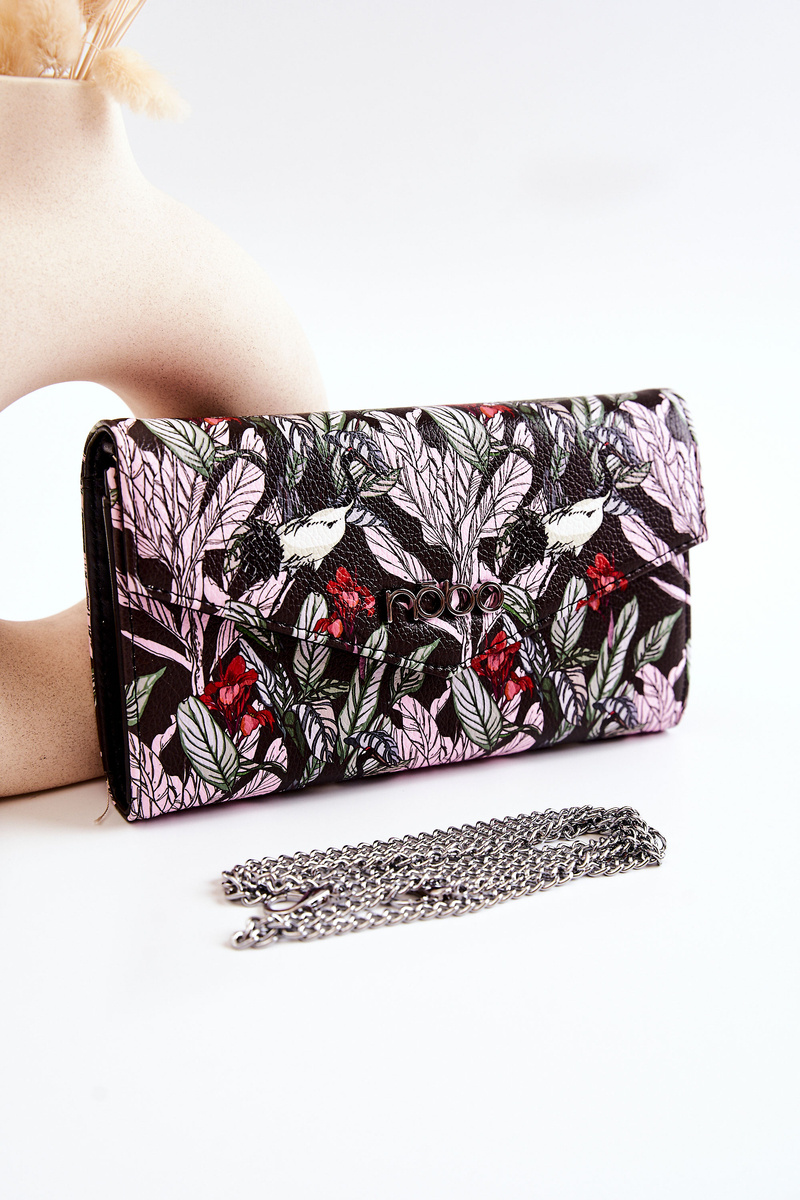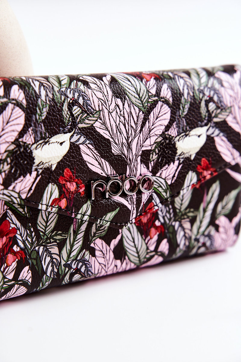 Duży, damski portfel zapinany na magnes. Został wykonany z wysokiej jakości eko skóry z dbałością o szczegóły. Na klapie logo marki Nobo. W środku znajdują się trzy komory - dwie posiadają miejsca na wizytówki czy karty płatnicze oraz banknoty, a jedna jest zapinana na zamek błyskawiczny. Dodatkowo do portfela jest dołączony metalowy łańcuszek, dlatego możesz go nosić także jako torebkę. Jest to świetne rozwiązanie w przypadku, gdy potrzebujesz mieć przy sobie tylko najpotrzebniejsze rzeczy jak dokumenty, pieniądze czy smartfon.