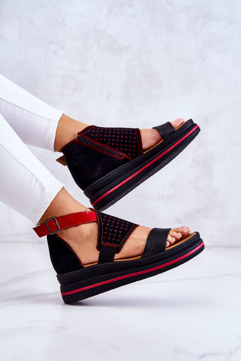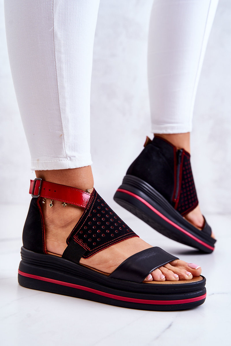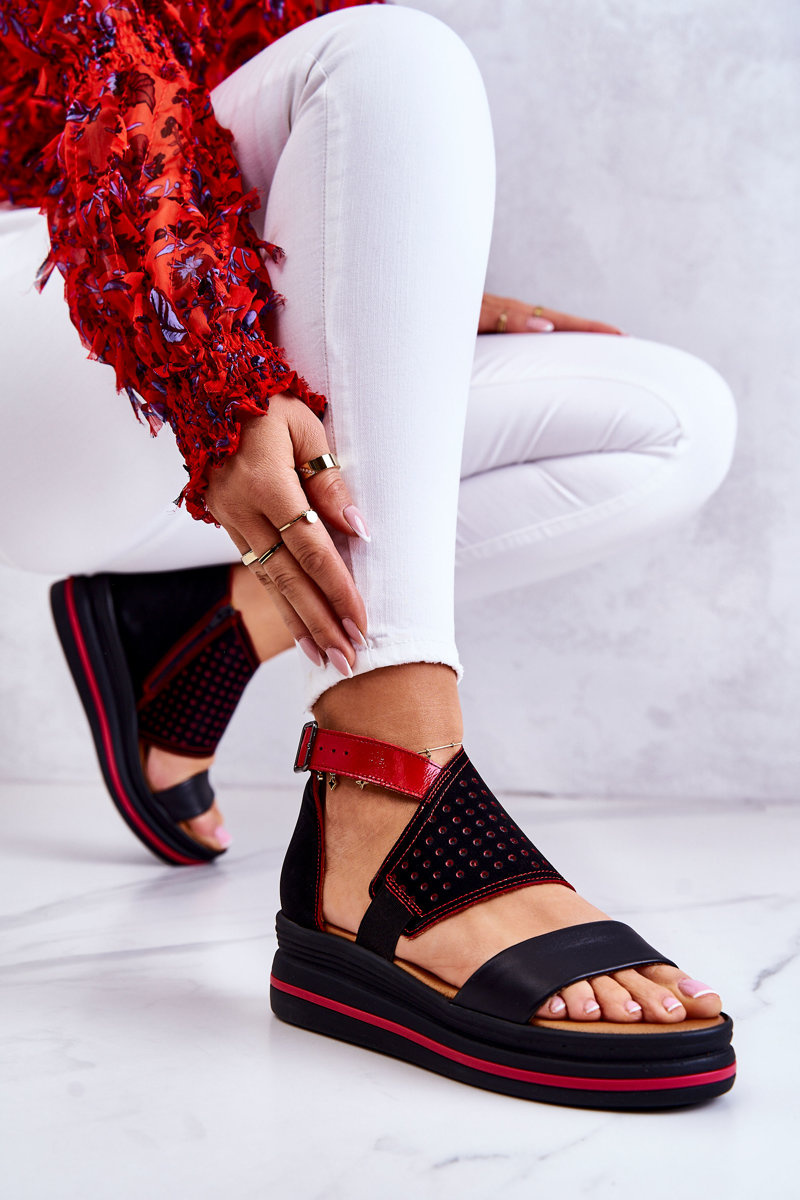 Skórzane Sandały Na Koturnie Maciejka 05356-01 Czarno-Czerwone