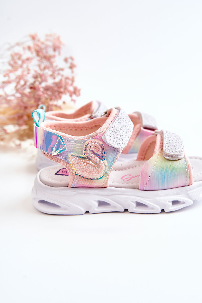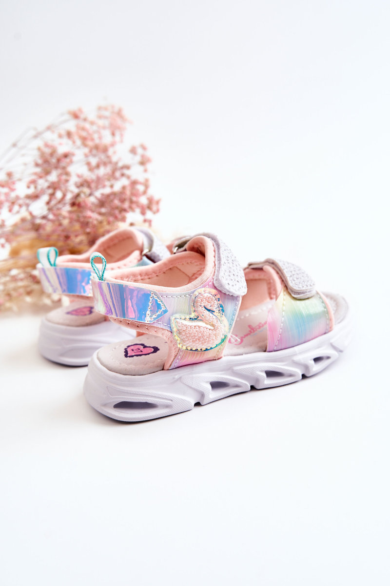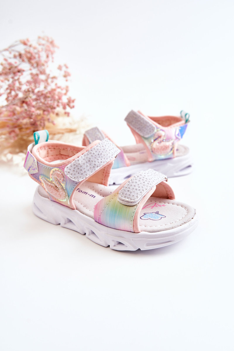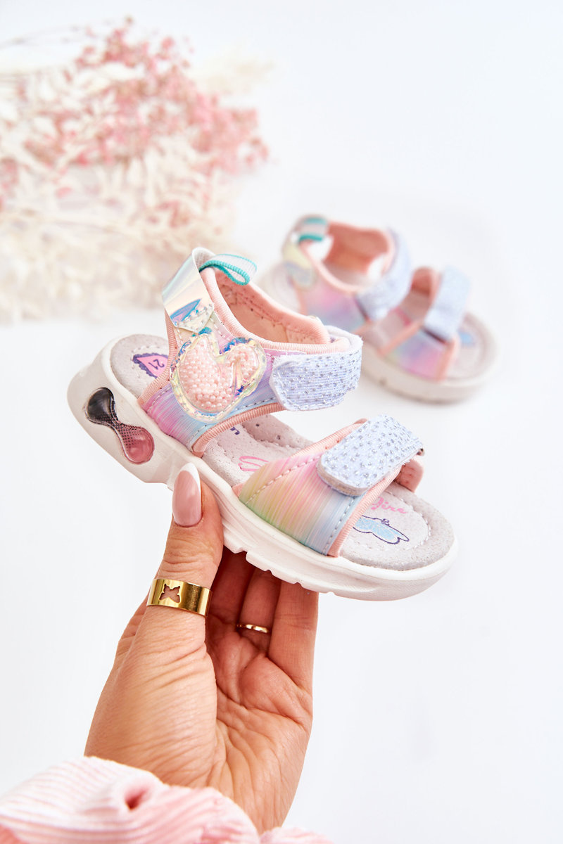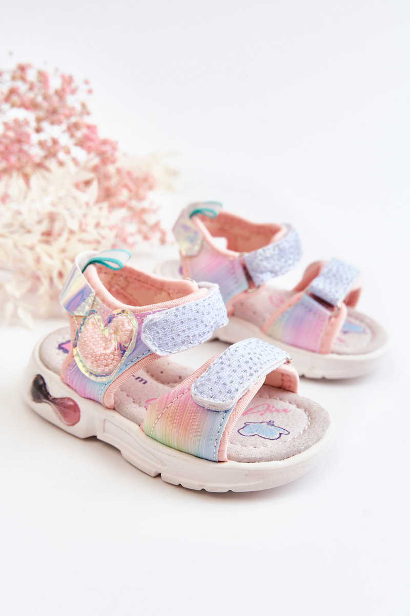 Śliczne sandałki dziecięce wykonane z materiału tekstylnego i tworzywa sztucznego. Posiadają rzepy przy palcach i przy kostce, które ułatwiają zakładanie obuwia. Buty posiadają świecący rzep. Z boku cholewki znajduje się uroczy element w postaci zwierzątka, który na pewno spodoba się niejednej, małej księżniczce! Miękka, profilowana wkładka zapewnia komfort podczas użytkowania. Podeszwa wykonana z tworzywa sztucznego. Sandałki w rozmiarach 21-26 różnią się podeszwą od rozmiarów 27-32. Przy wyborze rozmiaru prosimy sugerować się tabelą rozmiarów.