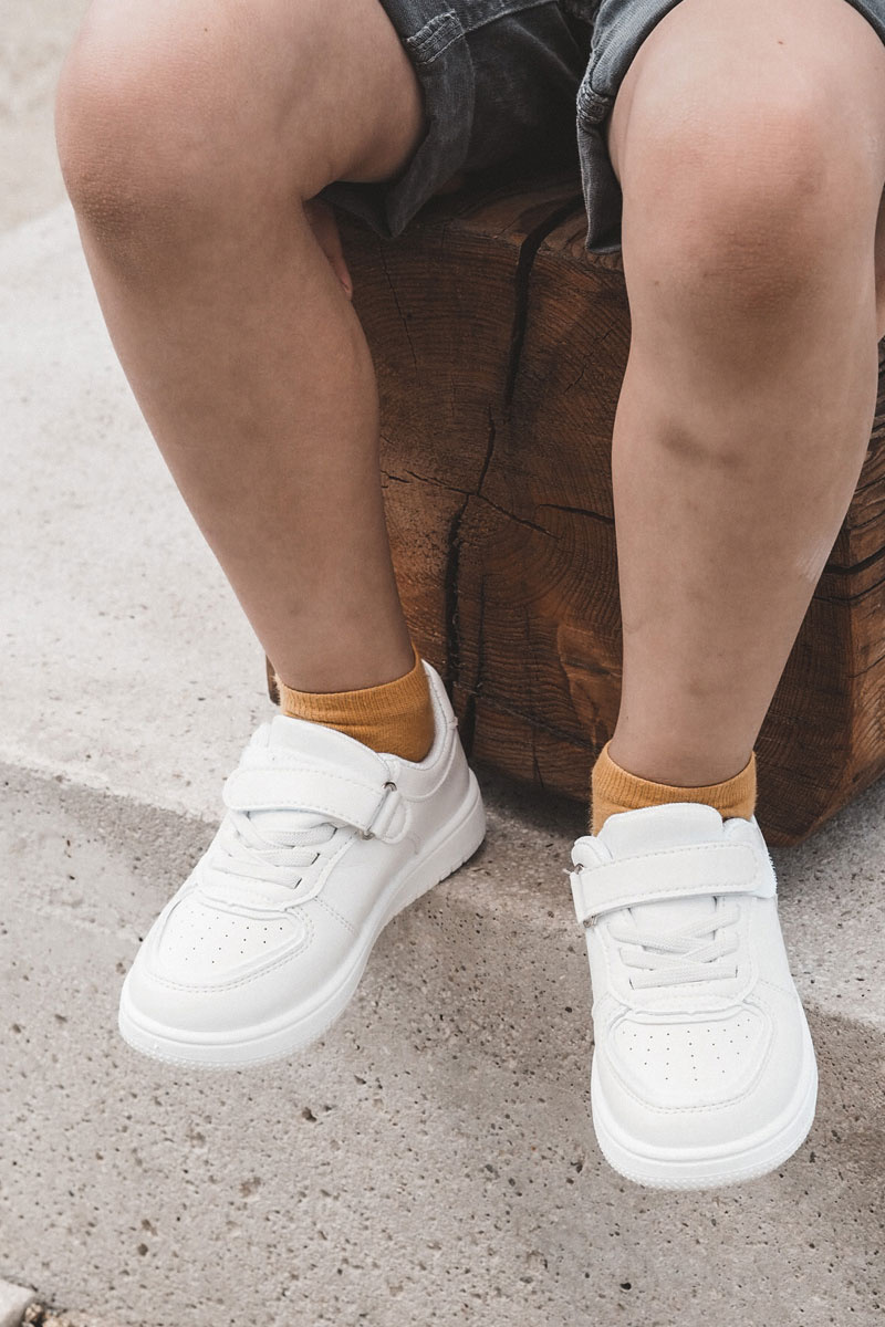 Klasyczne dziecięce buty sportowe z niską cholewką przed kostkę. Wykonane z wysokiej jakości eko skóry z perforacją z przodu. Zapinane na rzep, z dodatkowymi gumkami imitującymi sznurowadła. Delikatne usztywnienie na zapiętku. Podeszwa wykonana z gumowego tworzywa, która jest antypoślizgowa. Wkładka wykonana z naturalnej skóry. Buty idealne na wiele okazji: do przedszkola, do zabaw na świeżym powietrzu czy spacery. Idealny model dla Twojego malucha! Przy wyborze rozmiaru prosimy sugerować się tabelą rozmiarów.