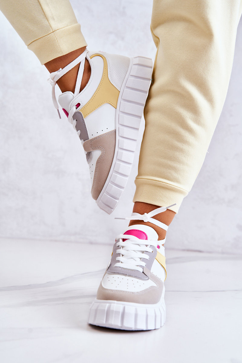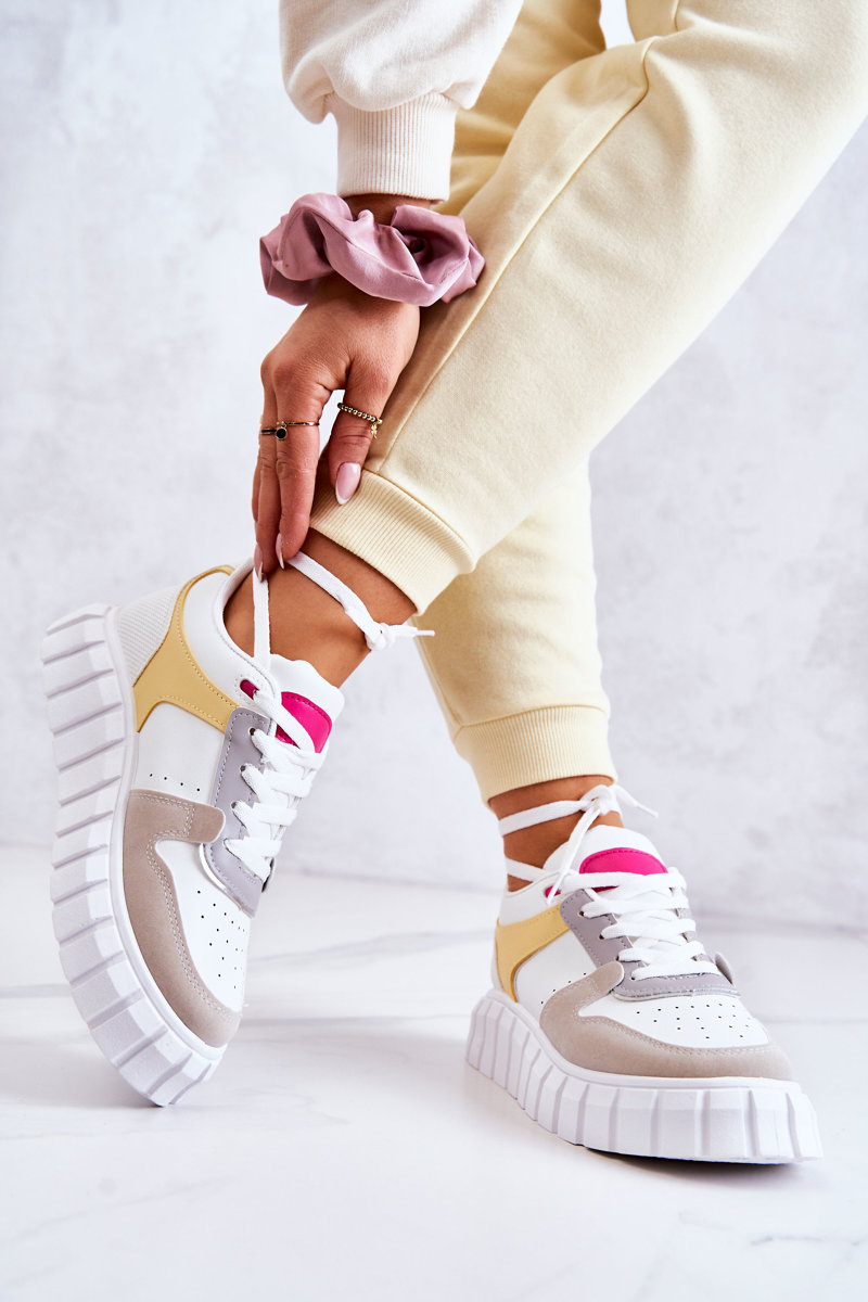 Buty sportowe, które koniecznie musisz mieć! Wykonane z połączenia wysokiej jakości eko skóry oraz eko zamszu. Osadzone na masywnej platformie ze żłobieniami po bokach. Delikatne perforacje z przodu oraz po bokach. Sneakersy posiadają wiązanie na płaskie sznurowadła, dzięki któremu można je idealnie dopasować. Miękka wkładka została wykonana z materiału i jest dodatkowo wyciągana. Koniecznie musisz je mieć w swojej szafie! Przy wyborze rozmiaru prosimy kierować tabelą rozmiarów.